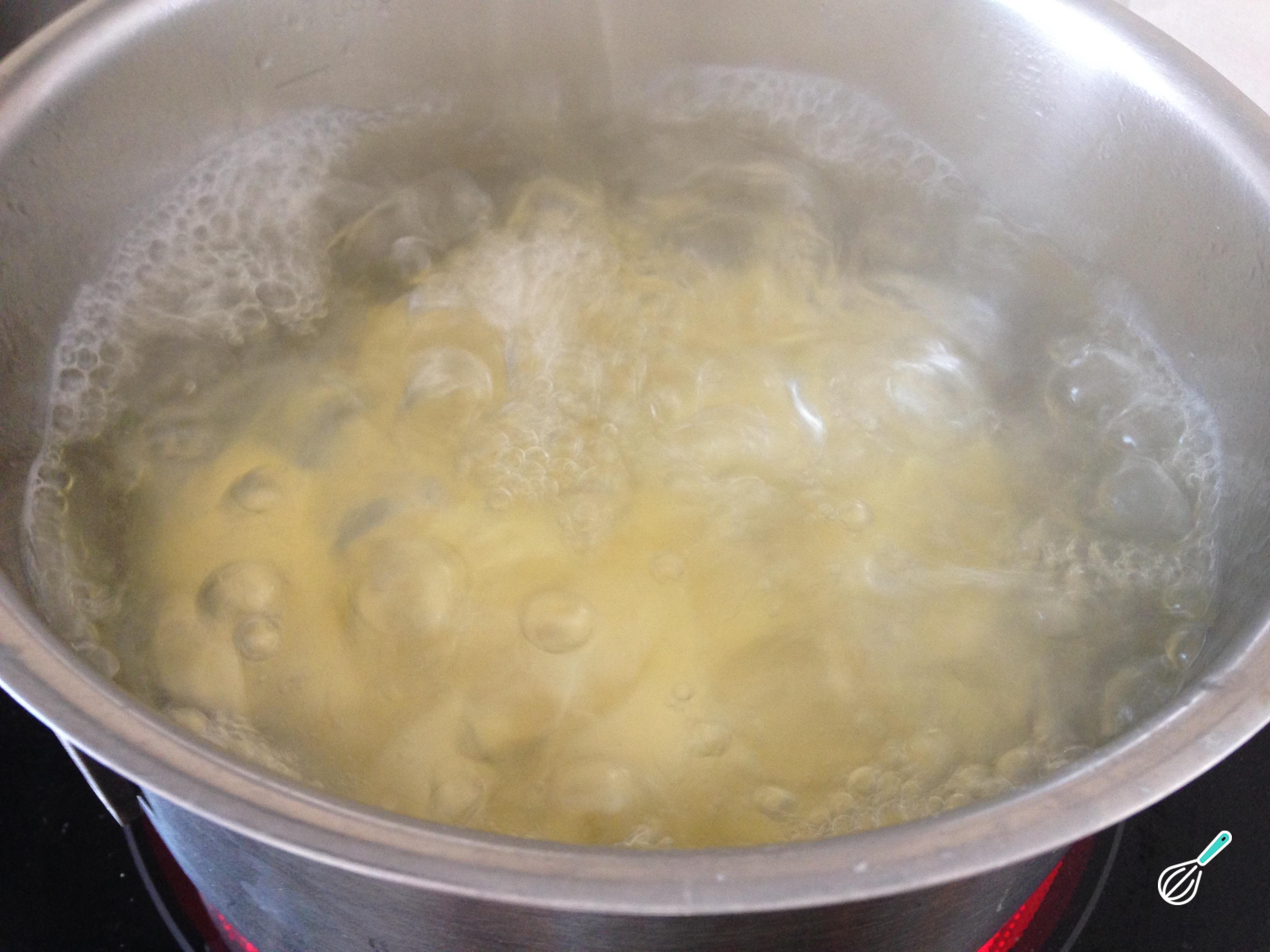 Descasque a batata, corte em cubos pequenos e coloque cozinhando numa panela com água fervente, até que esteja macia.