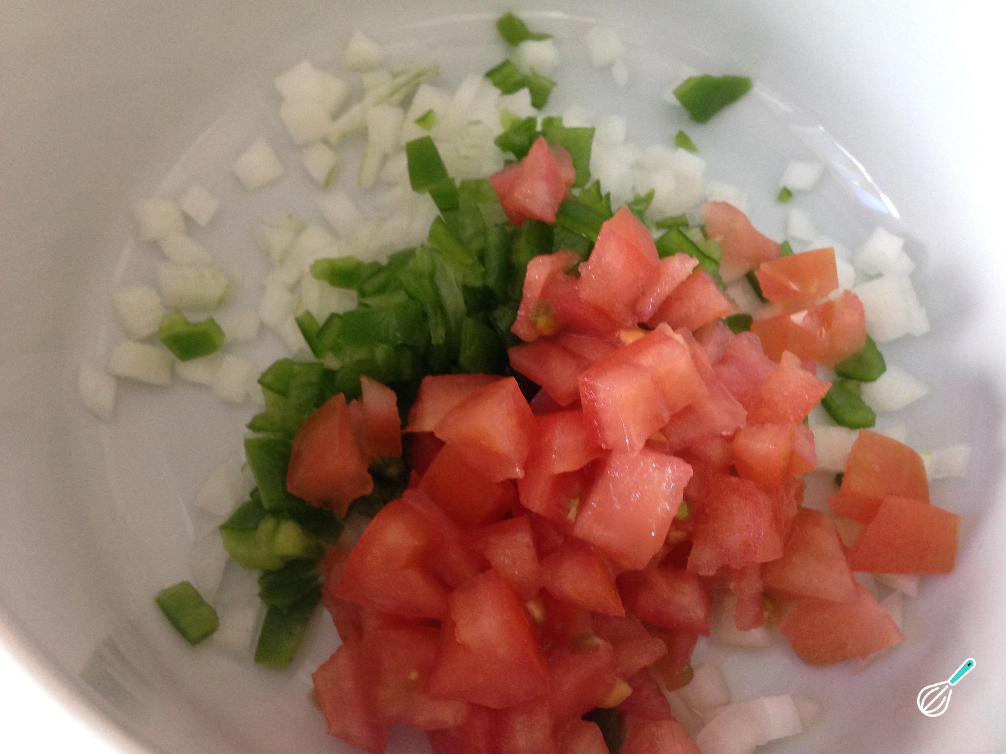 Enquanto isso, pique a cebolinha, a pimenta e o tomate em cubos pequenos.
