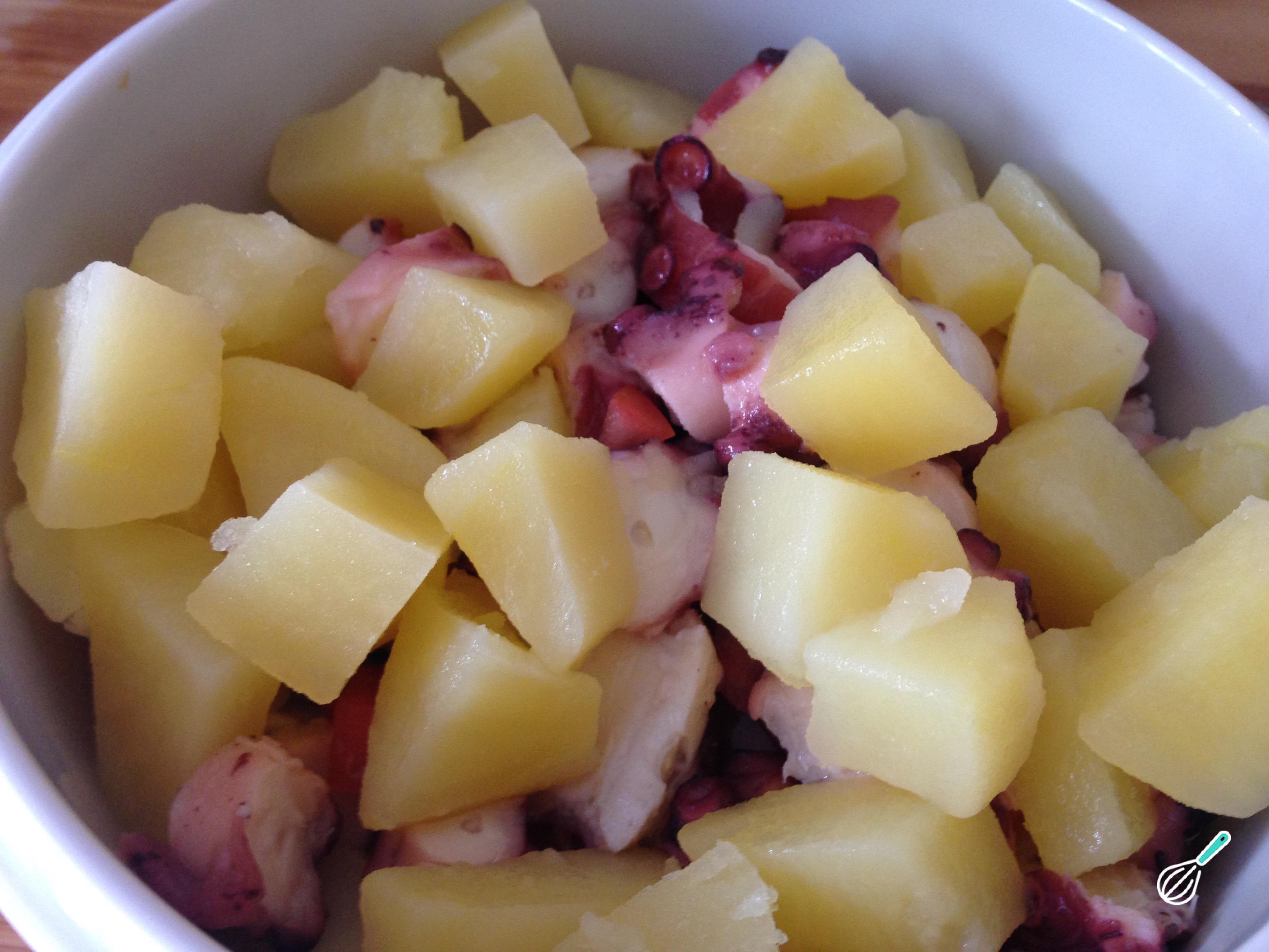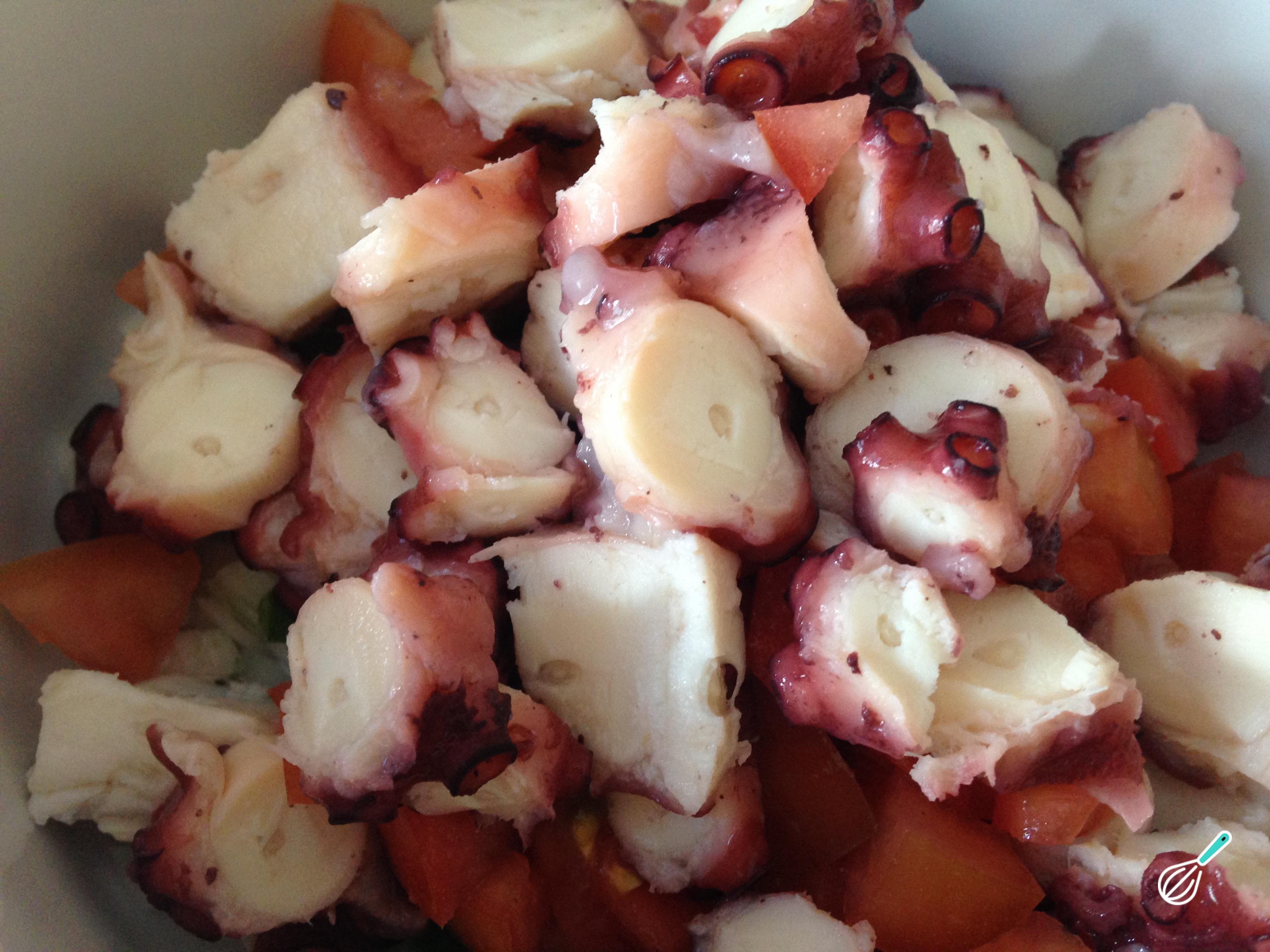 Corte em rodelas os tentáculos de polvo e coloque em uma tigela de servir junto com os ingredientes anteriores.