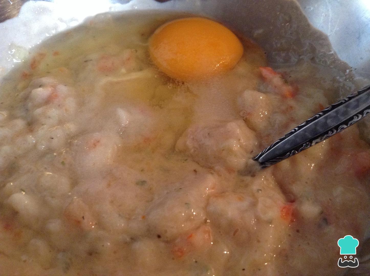 Agora adicione o ovo e o amido de milho. Misture bem os ingredientes das salsichas de frango, cubra a mistura com plástico filme, e reserve na geladeira por 30 minutos, para apurar os sabores.