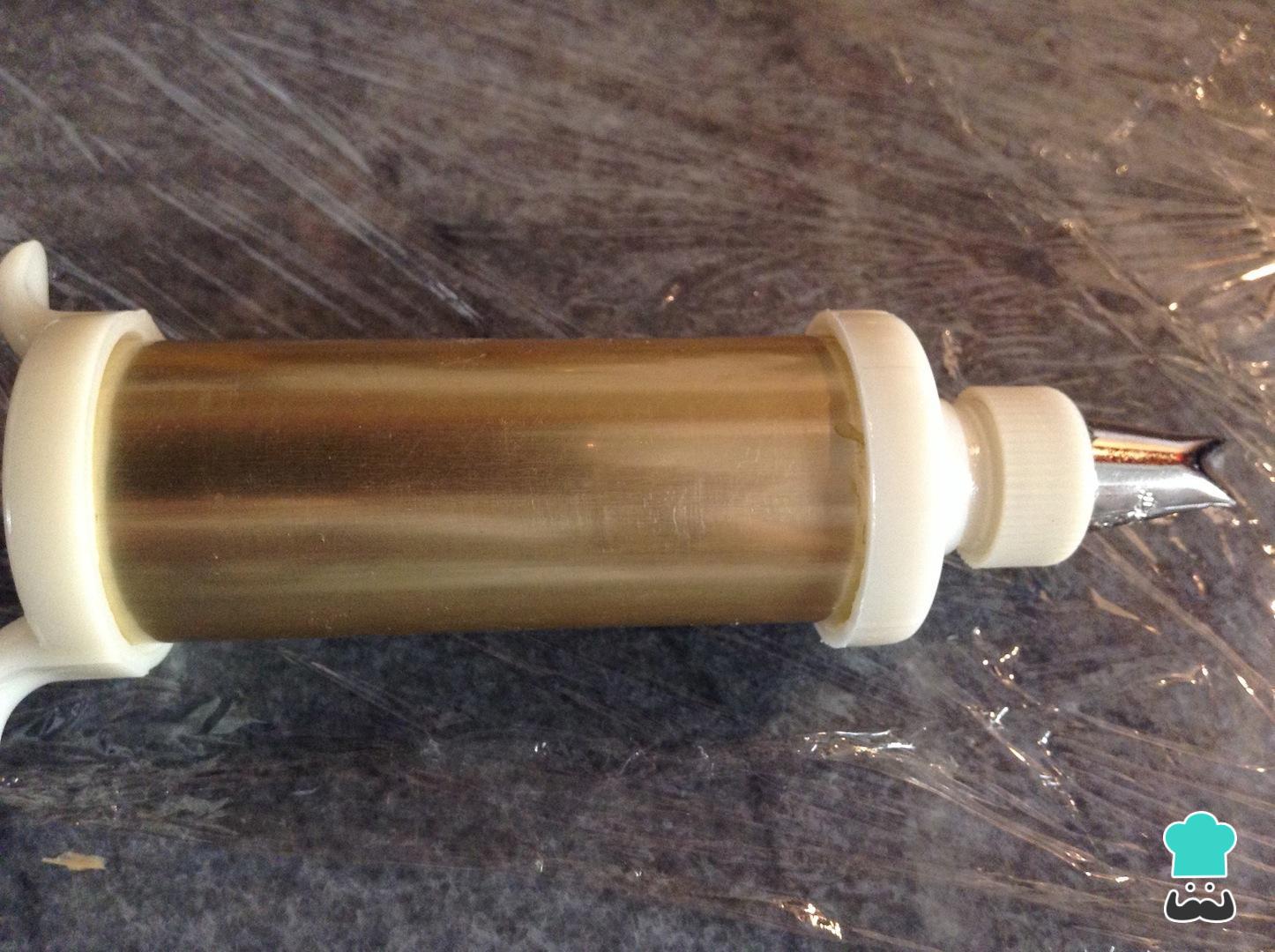 Após o passo anterior, coloque a mistura de salsichas caseiras em um saco de confeitar ou bisnaga, como mostrado na foto.