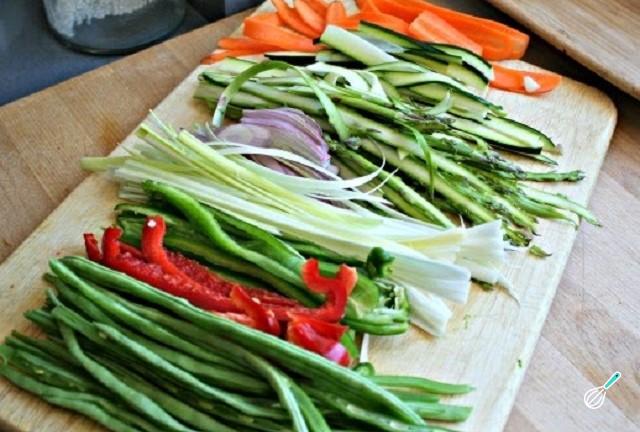 O salteado de vegetais japonês é muito fácil de preparar. O primeiro passo é cortar todos os vegetais em tirinhas (julienne). Pode fazê-lo com uma faca ou um descascador, procure fazer cortes imitando o formato do macarrão.