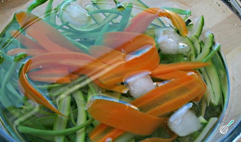 Separe o feijão verde, a abobrinha, a cenoura e os aspargos e cozinhe em água fervente por 2 minutos. Em seguida, passe os legumes por água fria para cortar o cozimento e reserve.