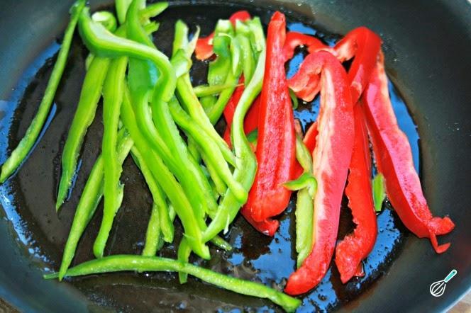 Comece por saltear as verduras, primeiro, adicionando os pimentões a uma panela quente com algumas gotas de óleo. Cozinhe por cerca de 3 minutos depois adicione a cebola e o alho-poró. Deixe cozinhar por mais 3 minutos.
