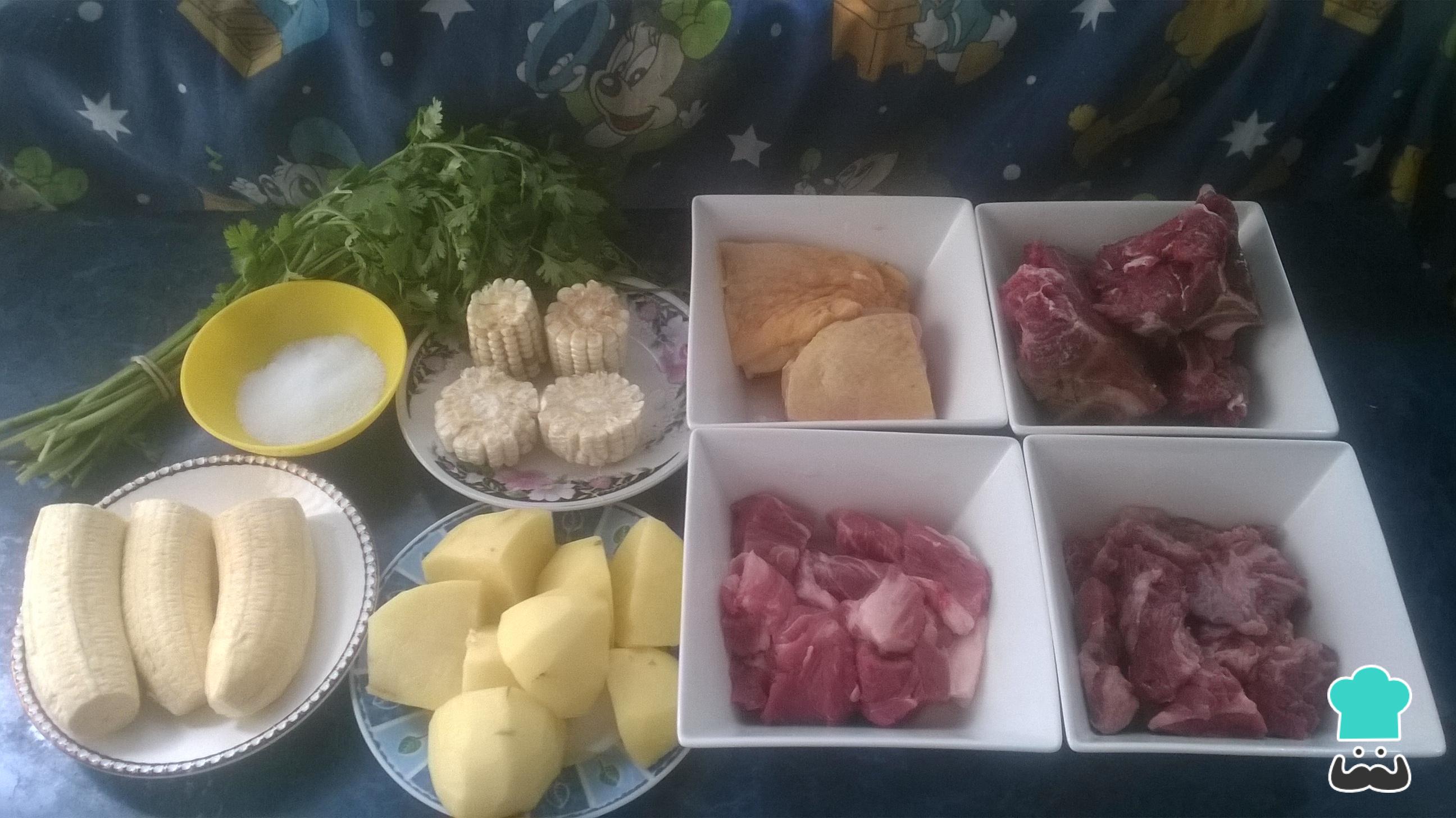 Para preparar esta receita de sancocho, junte todos os ingredientes acima indicados. Lembre-se que deve limpar e descascar os legumes e a banana, assim como cortar a carne em pedaços, como se observa na fotografia.