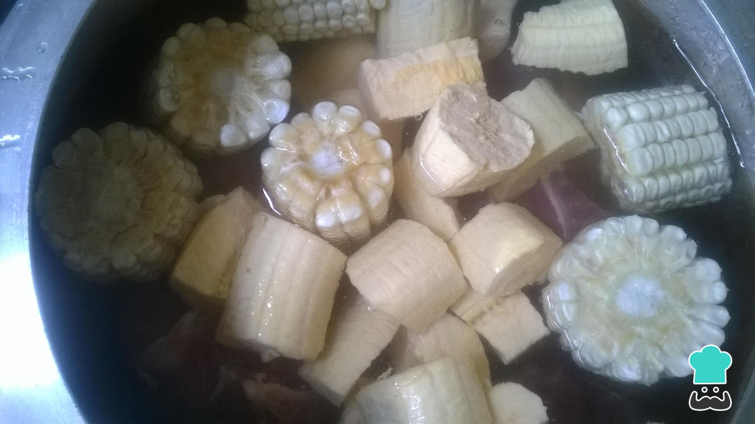 Numa panela de pressão, coloque bastante água e adicione a carne do peito, os ossos do pescoço, a espiga de milho e a banana cortada. Adicione sal e cozinhe no fogo médio por 40 minutos.