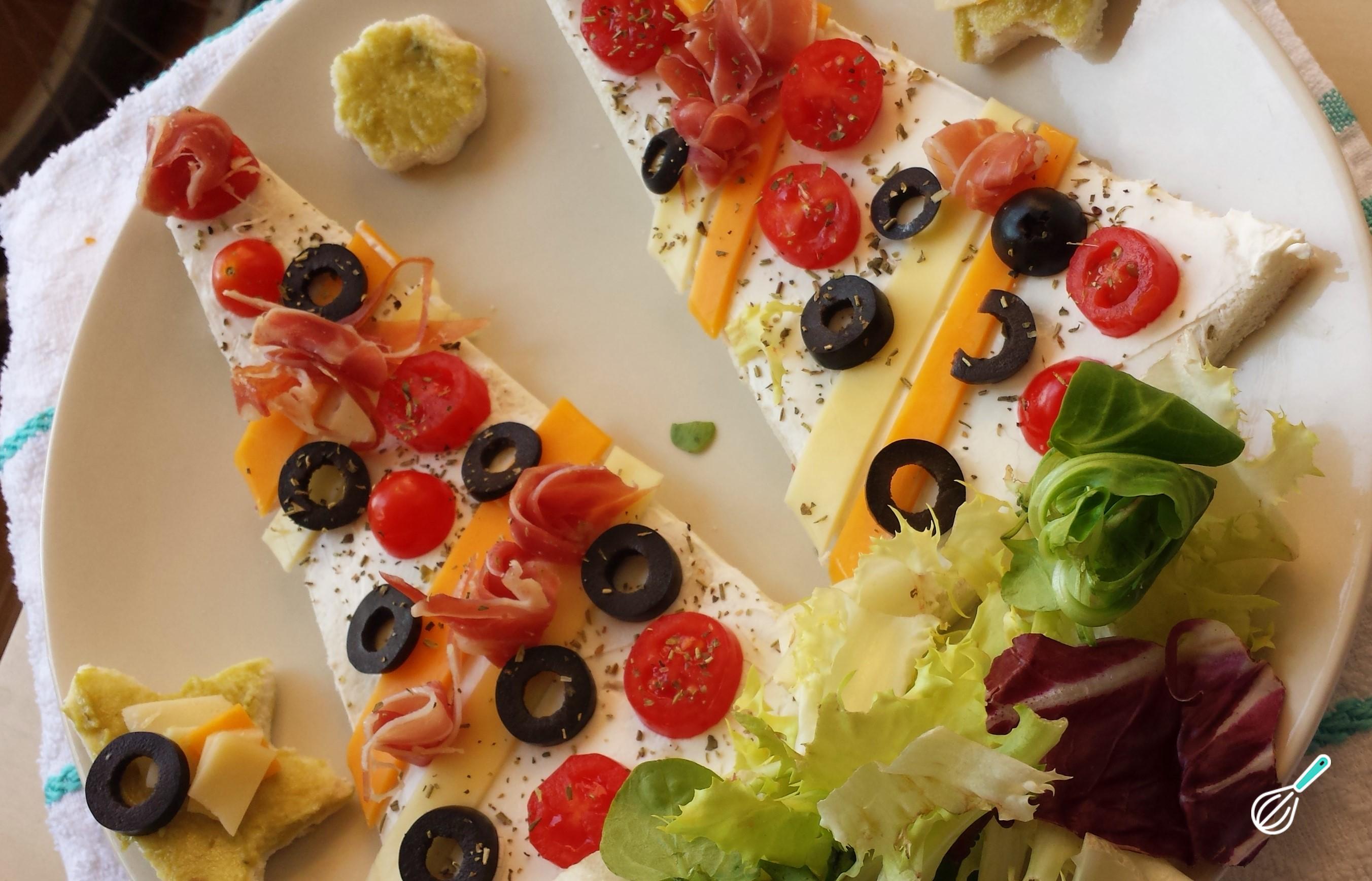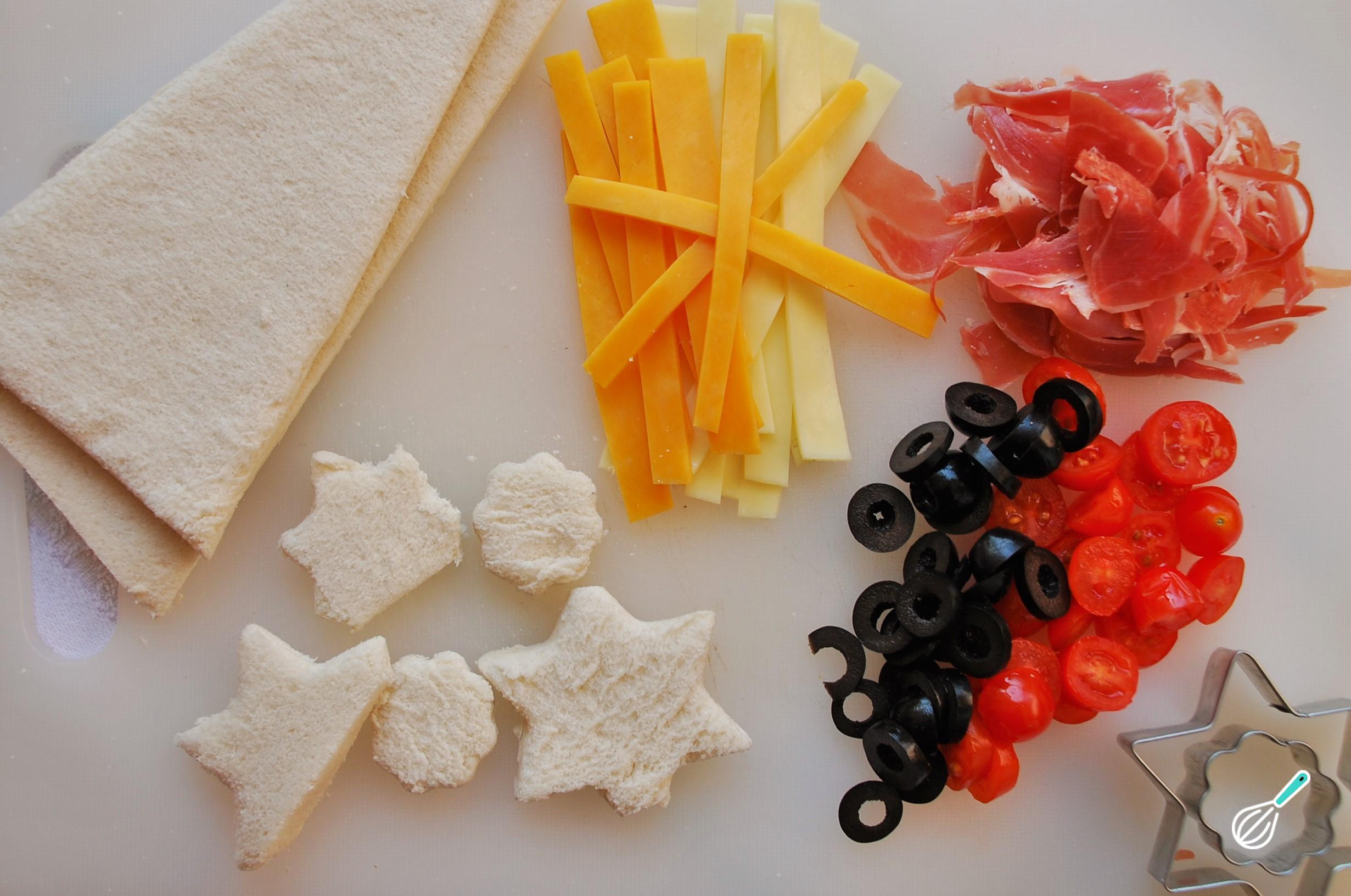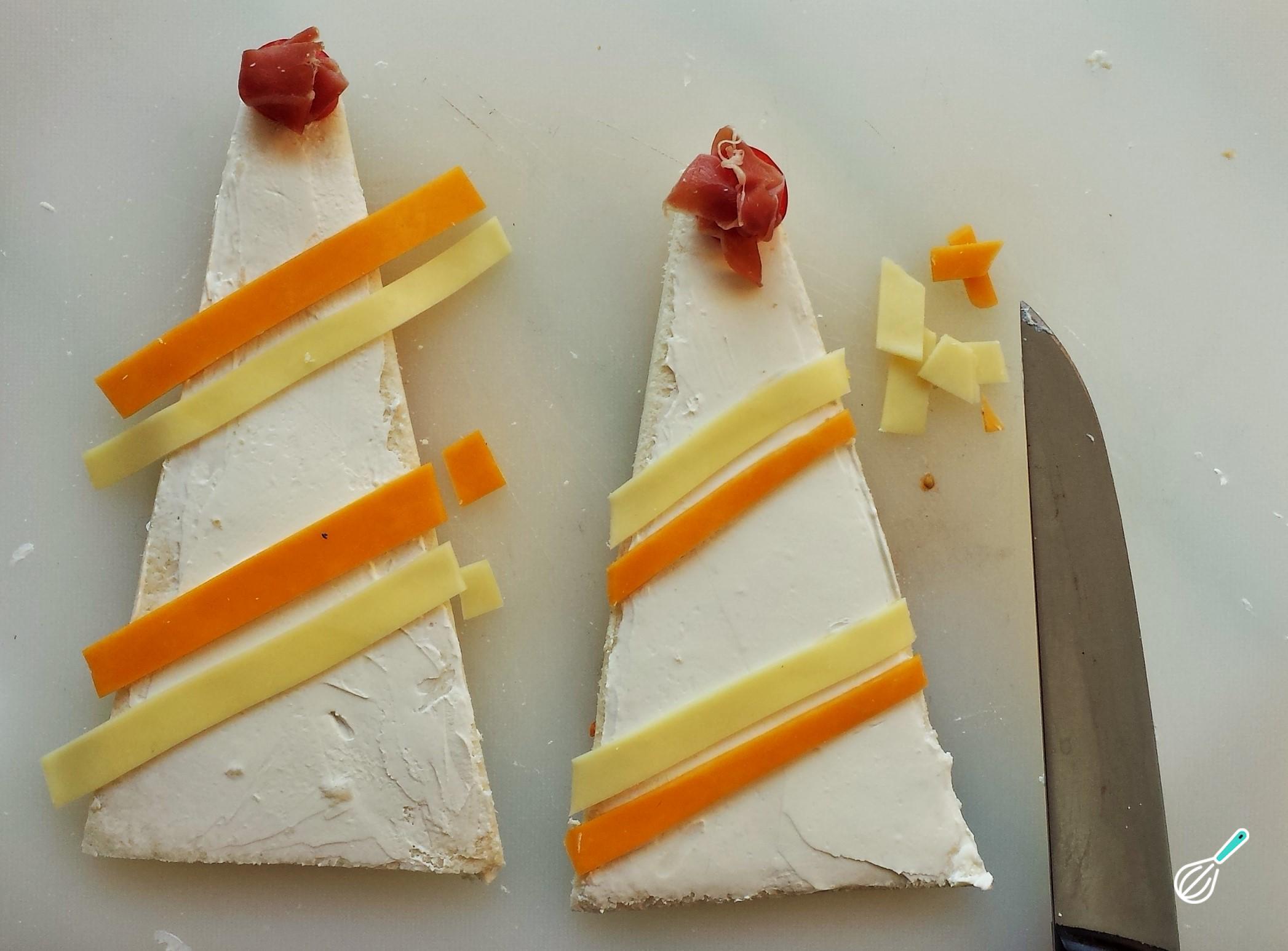De seguida corte as fatias de pão em forma de triângulo alto, como uma árvore. Corte os tomates e as azeitonas em rodelas, e o presunto e o queijo em tiras finas.