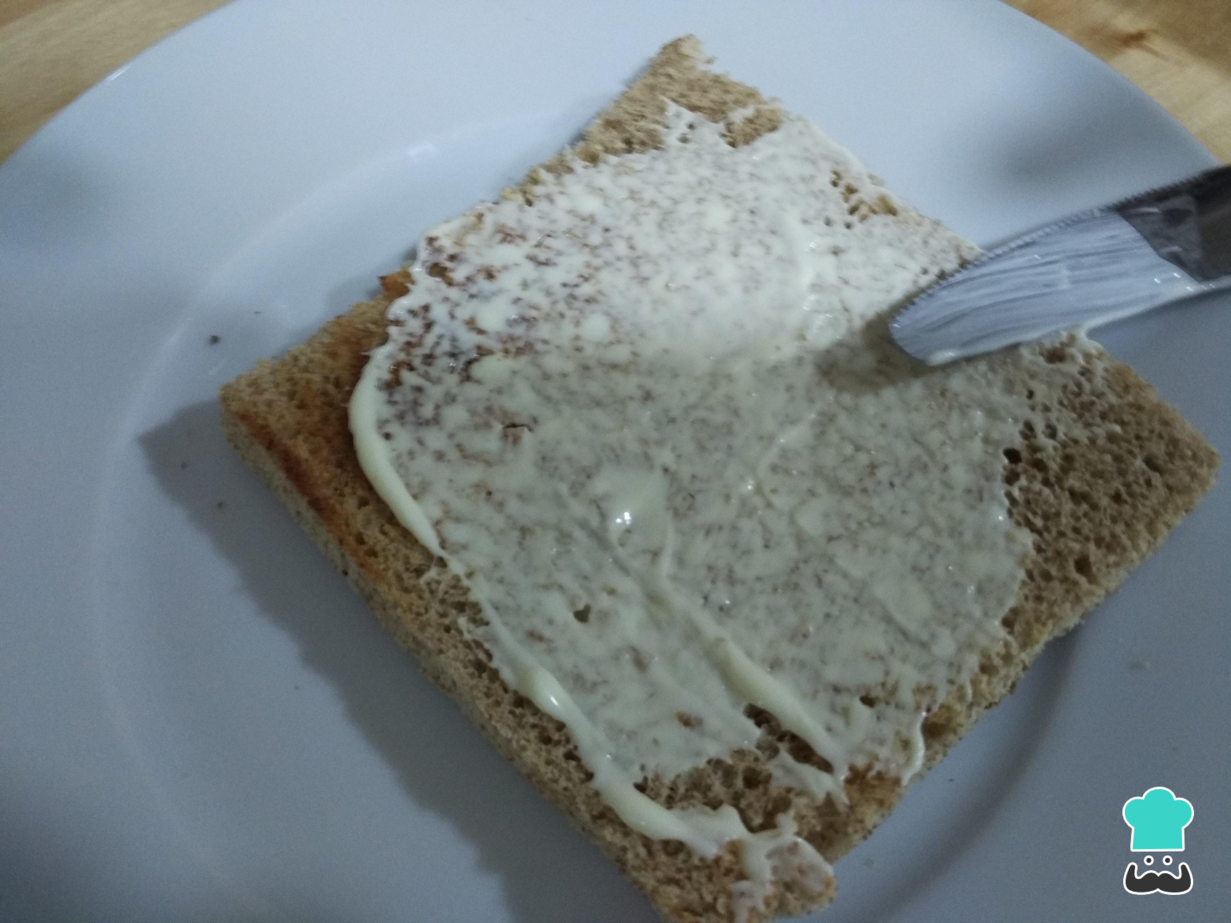 Para preparar o tradicional sanduíche com queijo e presunto, comece por untar uma fatia de pão com maionese e outra com mostarda. Se quiser, você pode fazer a maionese em casa, seguindo a receita de maionese caseira.