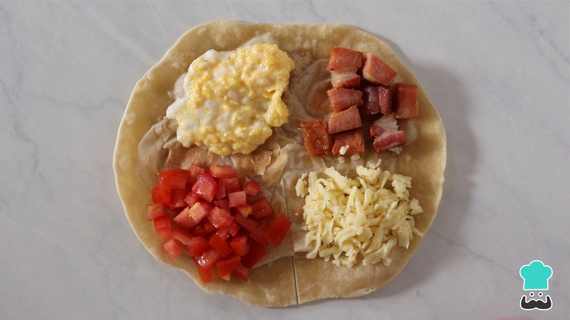 Comece separando os ingredientes. Nossa sugestão de recheio para o sanduíche com tortilla é ovo, queijo, tomate e bacon. Frite os ovos e tempere com sal e pimenta. Frite o bacon também. Rale a muçarela e tempere o tomate cortado em cubos com sal, pimenta e cominho.