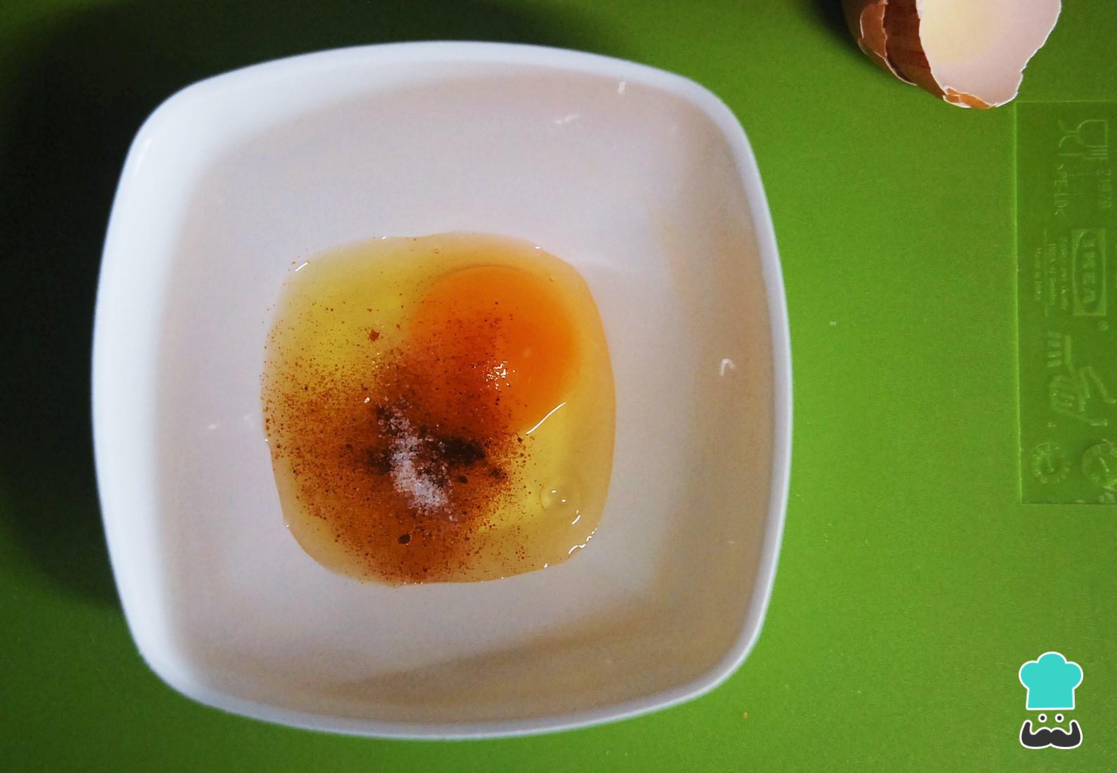 O primeiro passo para preparar este delicioso sanduíche com ovo e bacon é bater o ovo com os temperos. Você pode temperar a gosto, mas eu recomendo que experimente a combinação de sal, pimenta e páprica picante, que é simples e deliciosa.