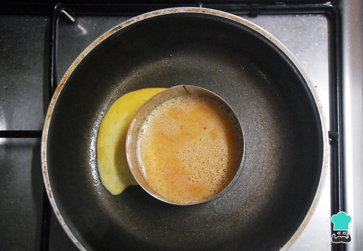 Em seguida, unte uma frigideira e leve ao fogo médio-baixo. Frite o ovo do jeito tradicional ou dentro de um aro de cozinha, para que fique bem redondinho. Reserve quando estiver cozinhado ao seu gosto.