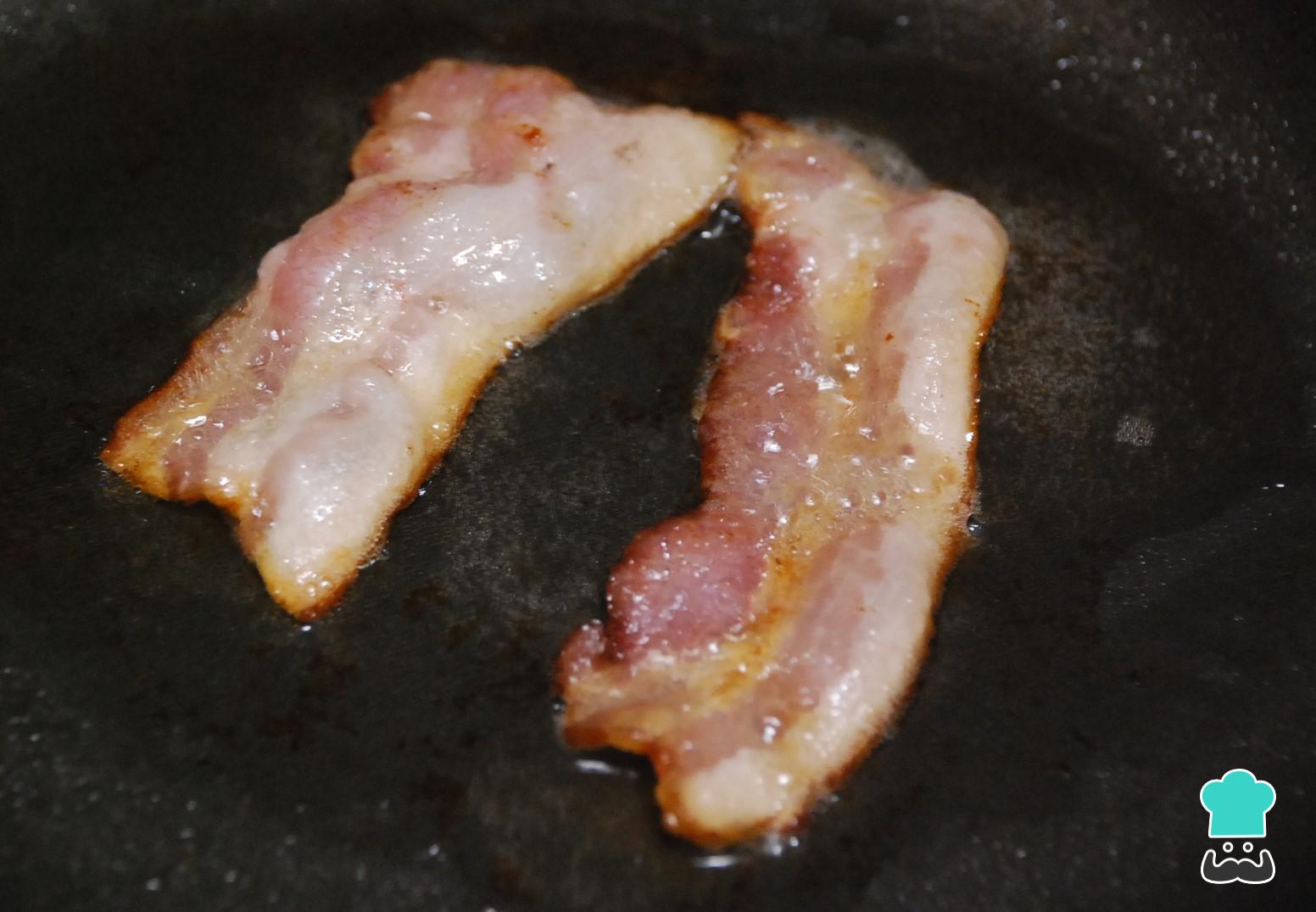 Na mesma frigideira, e em fogo baixo, cozinhe o bacon sem adicionar mais gordura. Quando estiver crocante, retire para um prato com papel absorvente, para eliminar o excesso de gordura.