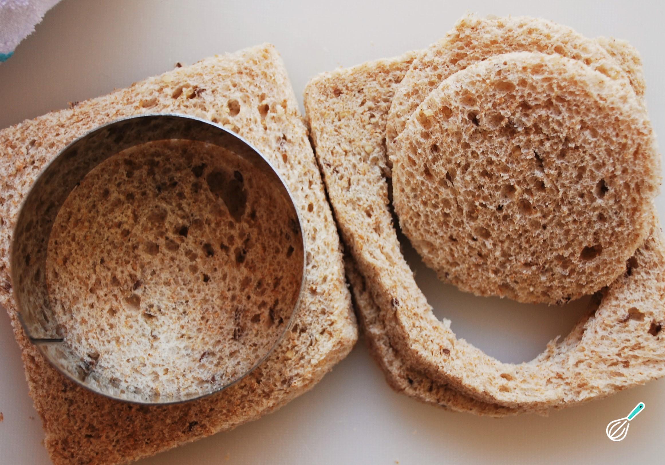 Comece preparando esta receita de lanche prático separando 2 fatias de pão para cada fatia de presunto e de queijo. Em metade das fatias de pão corte um disco ao centro, para colocar o ovo.