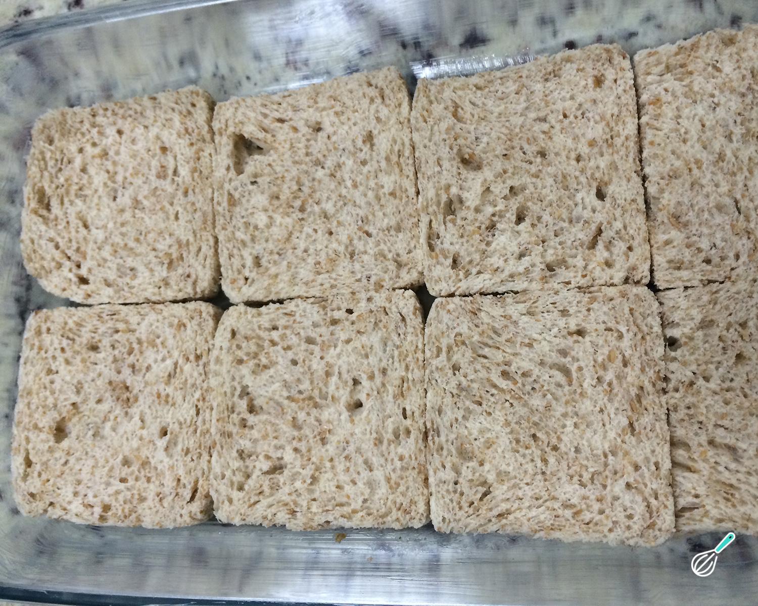 Numa assadeira untada monte o sanduíche colocando uma fatia de pão inteiro, depois o queijo, o presunto, a fatia cortada e o ovo ao centro. Tempere o ovo com sal e pimenta a gosto.