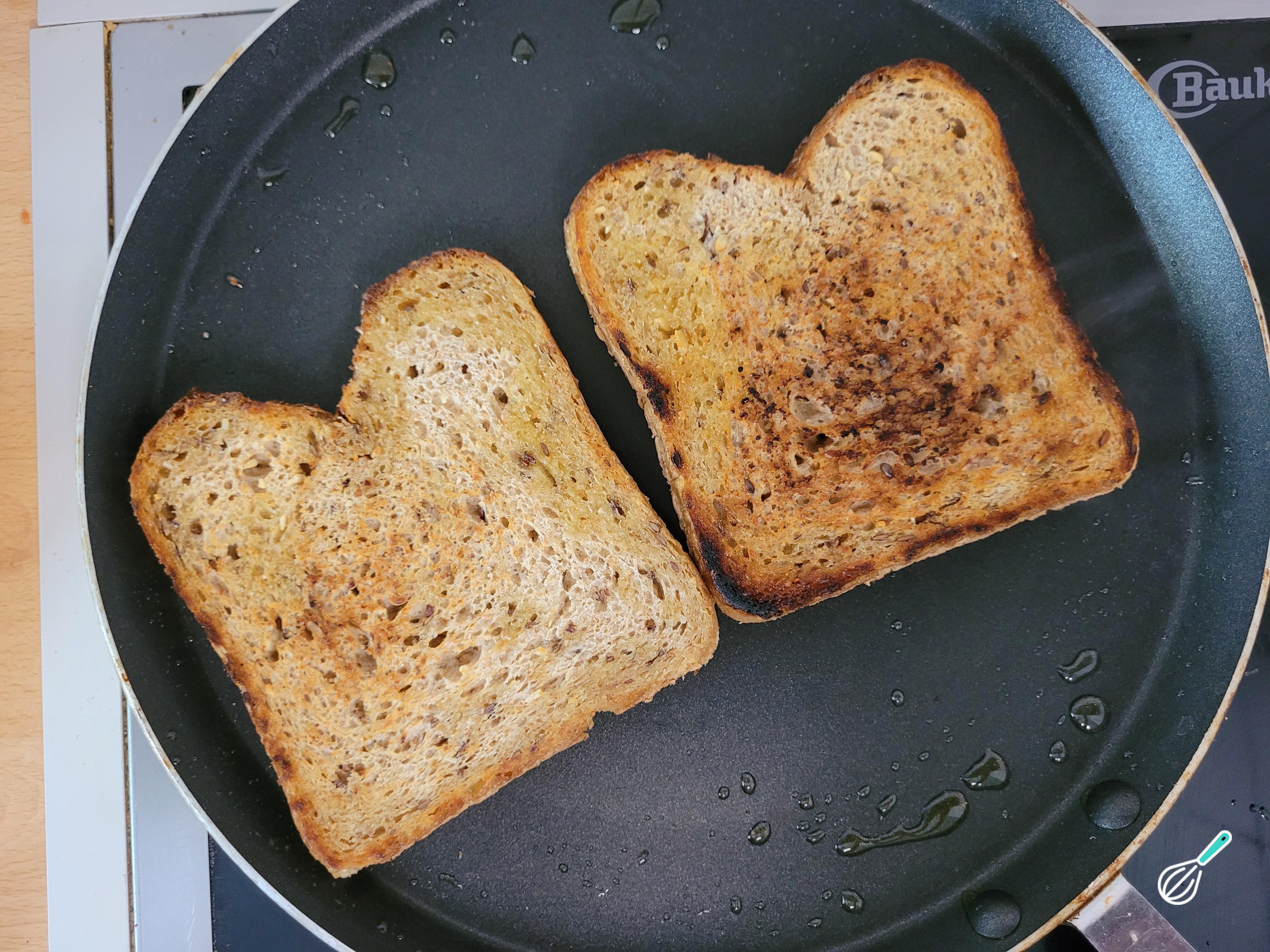 Em uma frigideira com um pouquinho de manteiga, coloque as fatias de pão para darem uma dourada. Enquanto isso, corte metade do avocado em fatias.