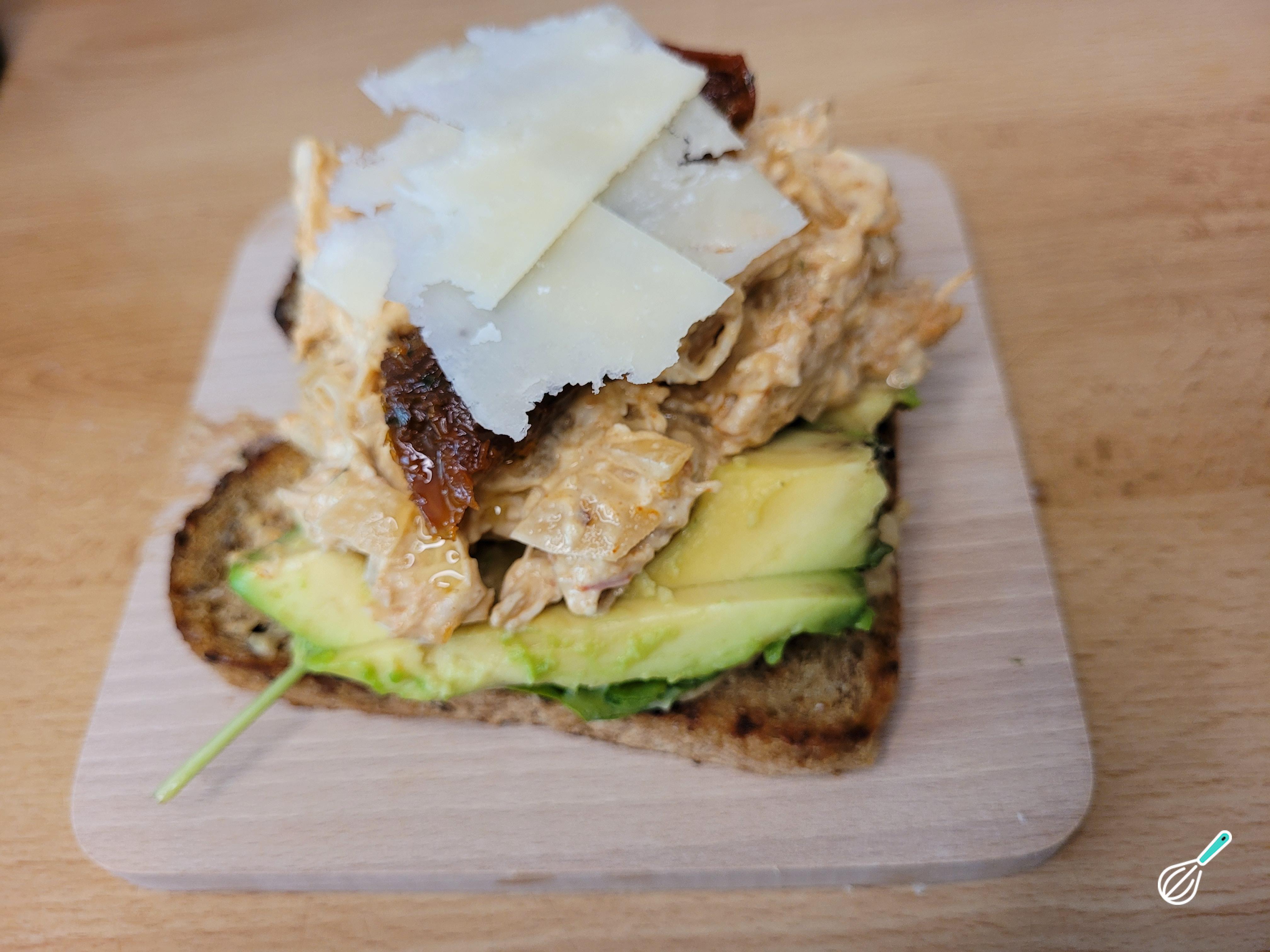 Monte o sanduíche colocando uma fatia de pão, a metade do molho reservada, rúcula, o avocado, o frango, tomate seco e o parmesão e feche com a outra fatia de pão.