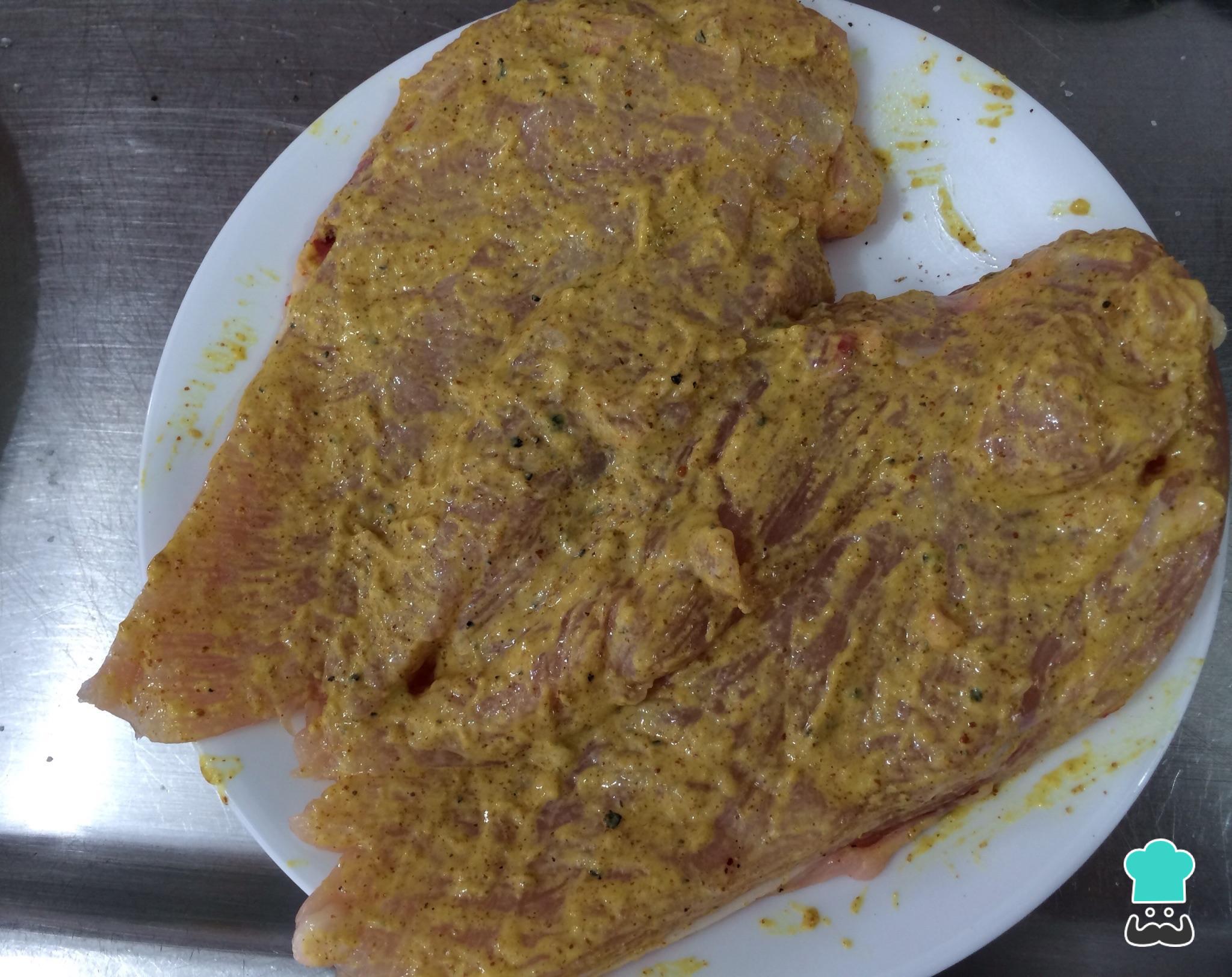 Tempere os peitos de frango com mostarda, sal e pimenta. Reserve na geladeira por 30 minutos.