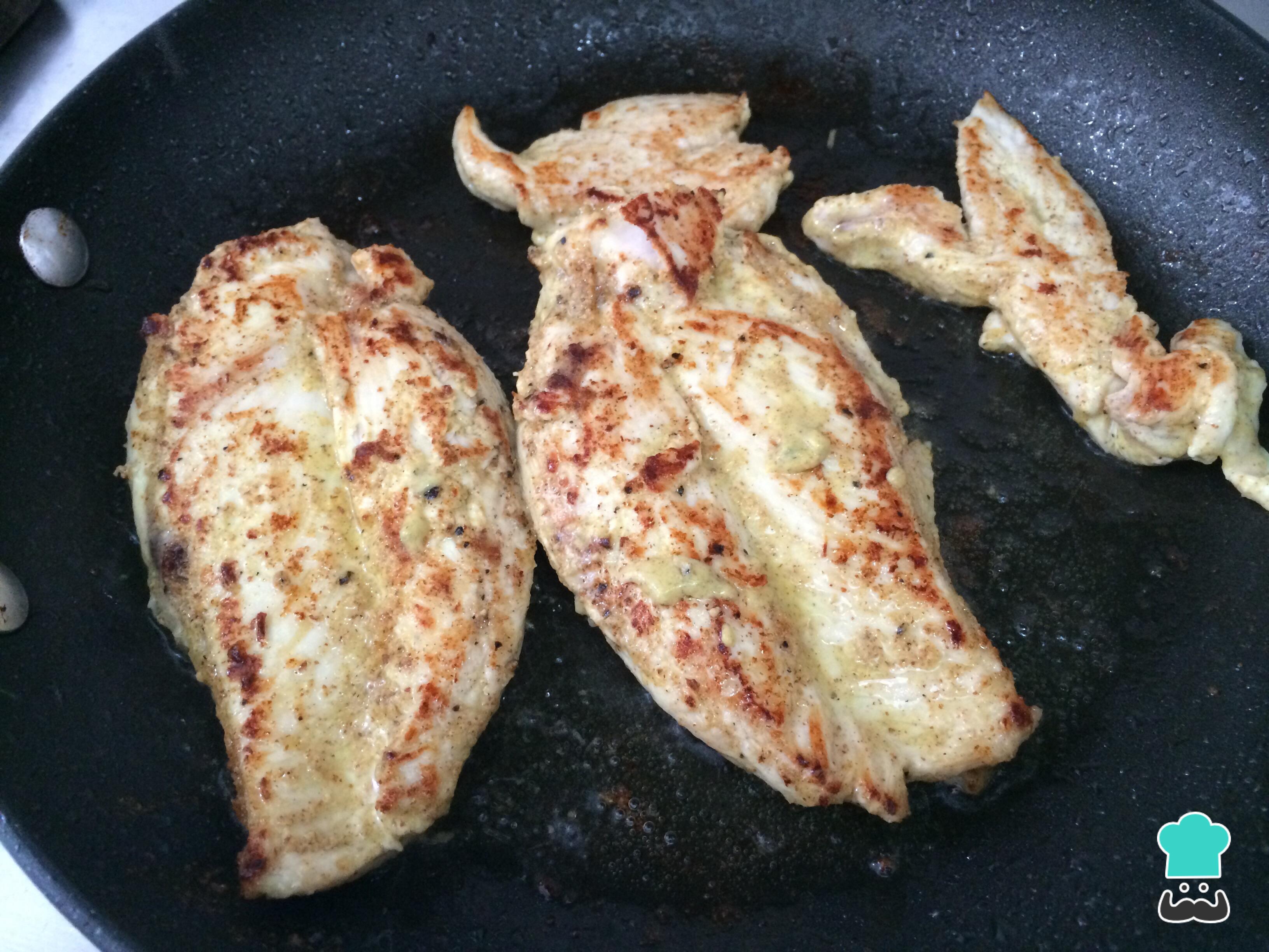 Após esse tempo, o passo seguinte da sanduíche de frango no pão árabe é cozinhar os peitos de frango em uma frigideira com um pouco de azeite, até ficarem dourados e completamente cozinhados.