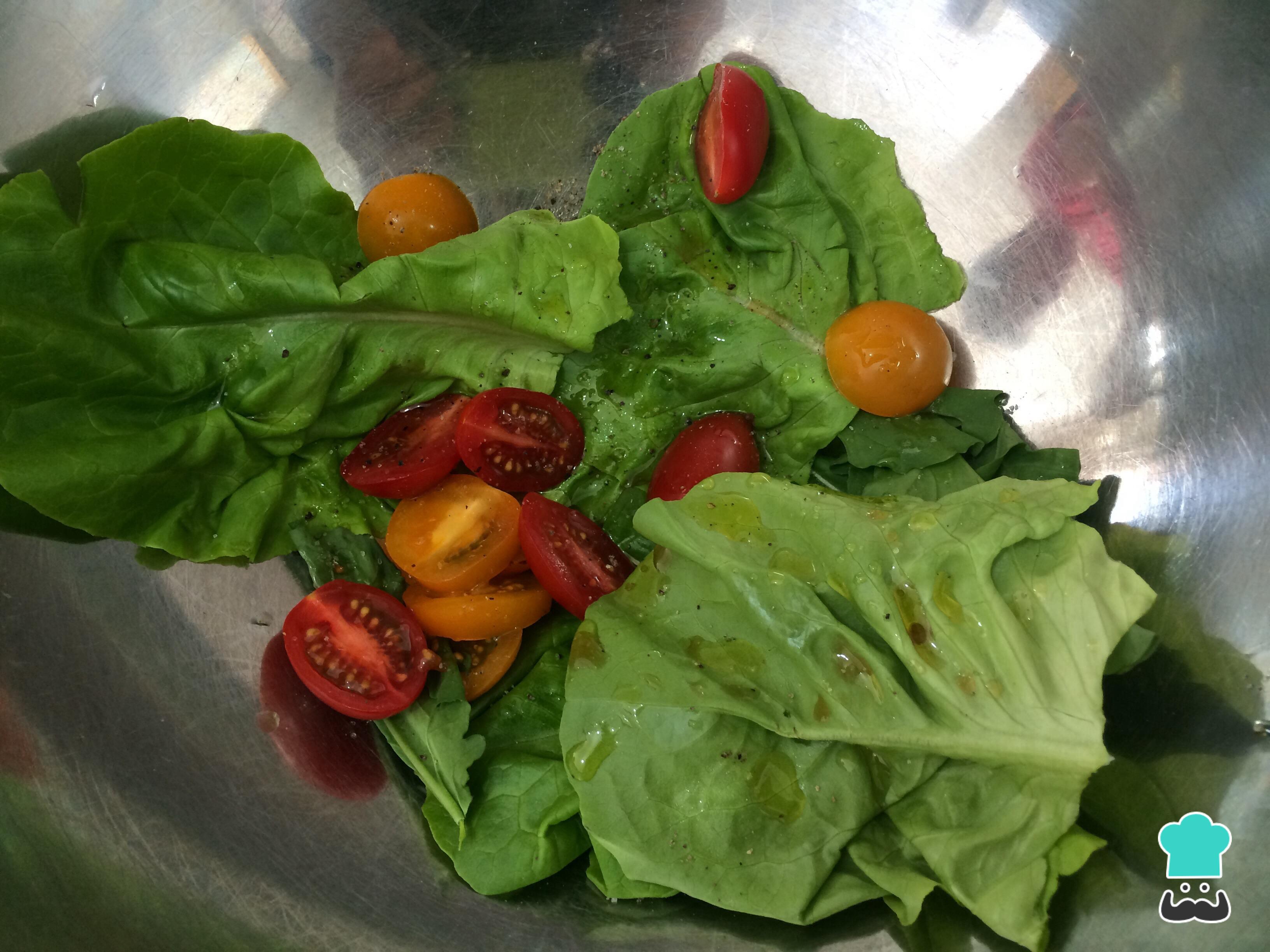 Lave as folhas de alface e os tomates cereja. Coloque ambos em uma tigela e tempere com azeite de oliva, vinagre balsâmico, sal e pimenta a gosto. Misture bem para espalhar estes temperos.