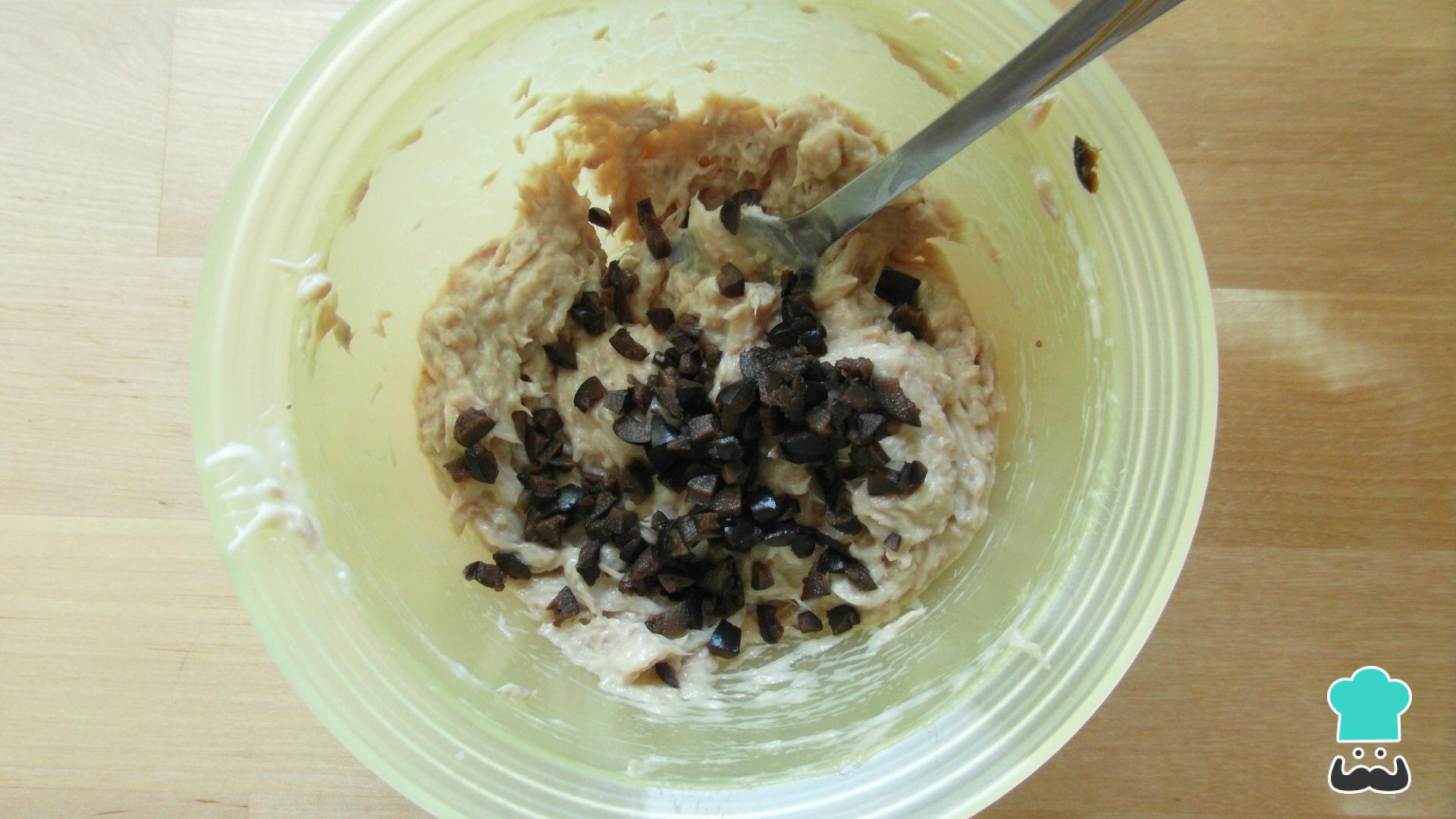 Para fazer esta receita de pão de metro para festa, comece por escorrer o atum. Em seguida misture com a cebola, a maionese, as azeitonas e a salsinha, como se estivessem preparando um patê de atum. Acerte o sabor a gosto com sal e pimenta.