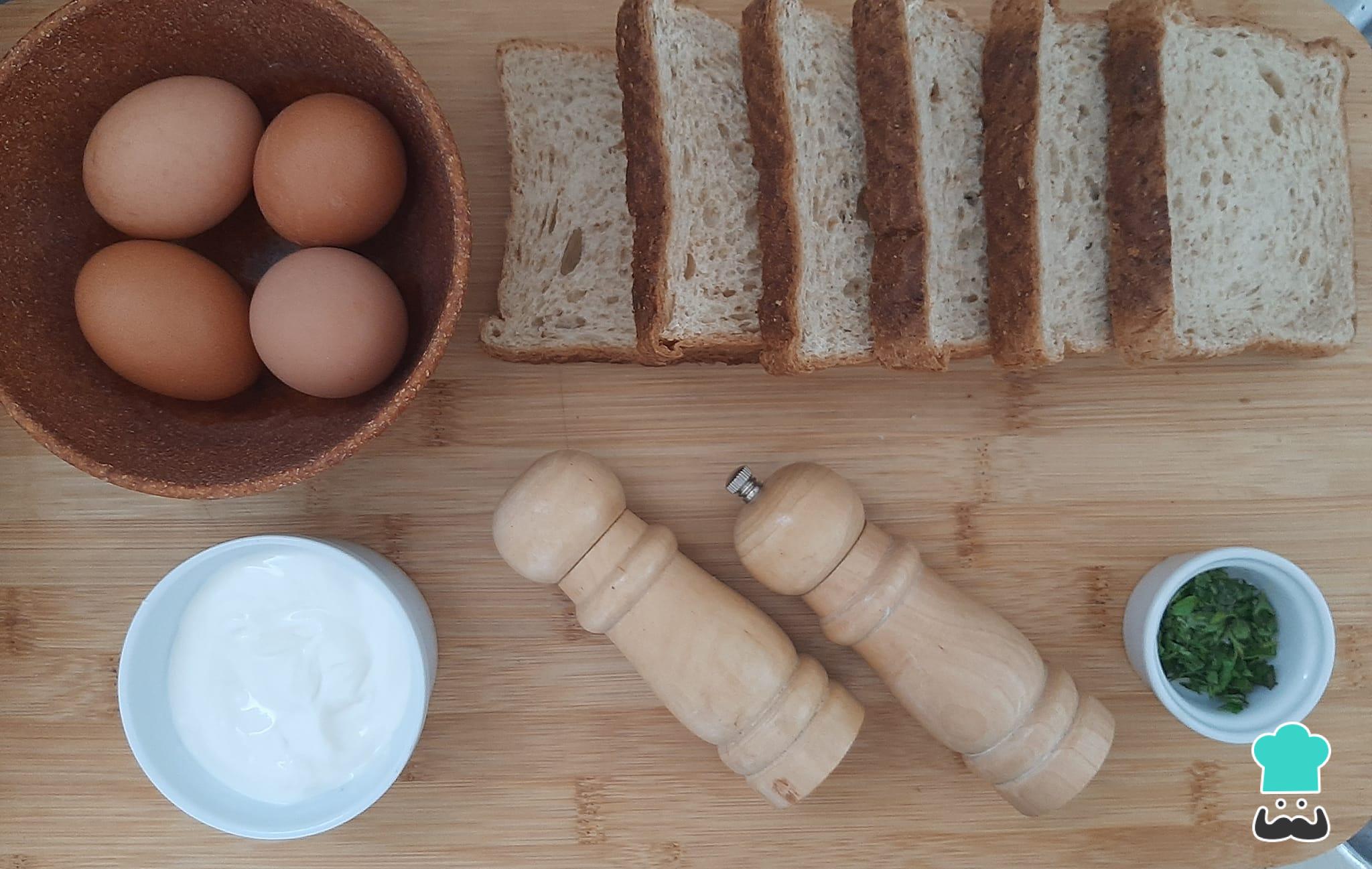 Separe os ingredientes necessários para preparar o sanduíche de ovo cozido. Se quiser, substitua o requeijão cremoso por maionese, ricota, cream cheese...
