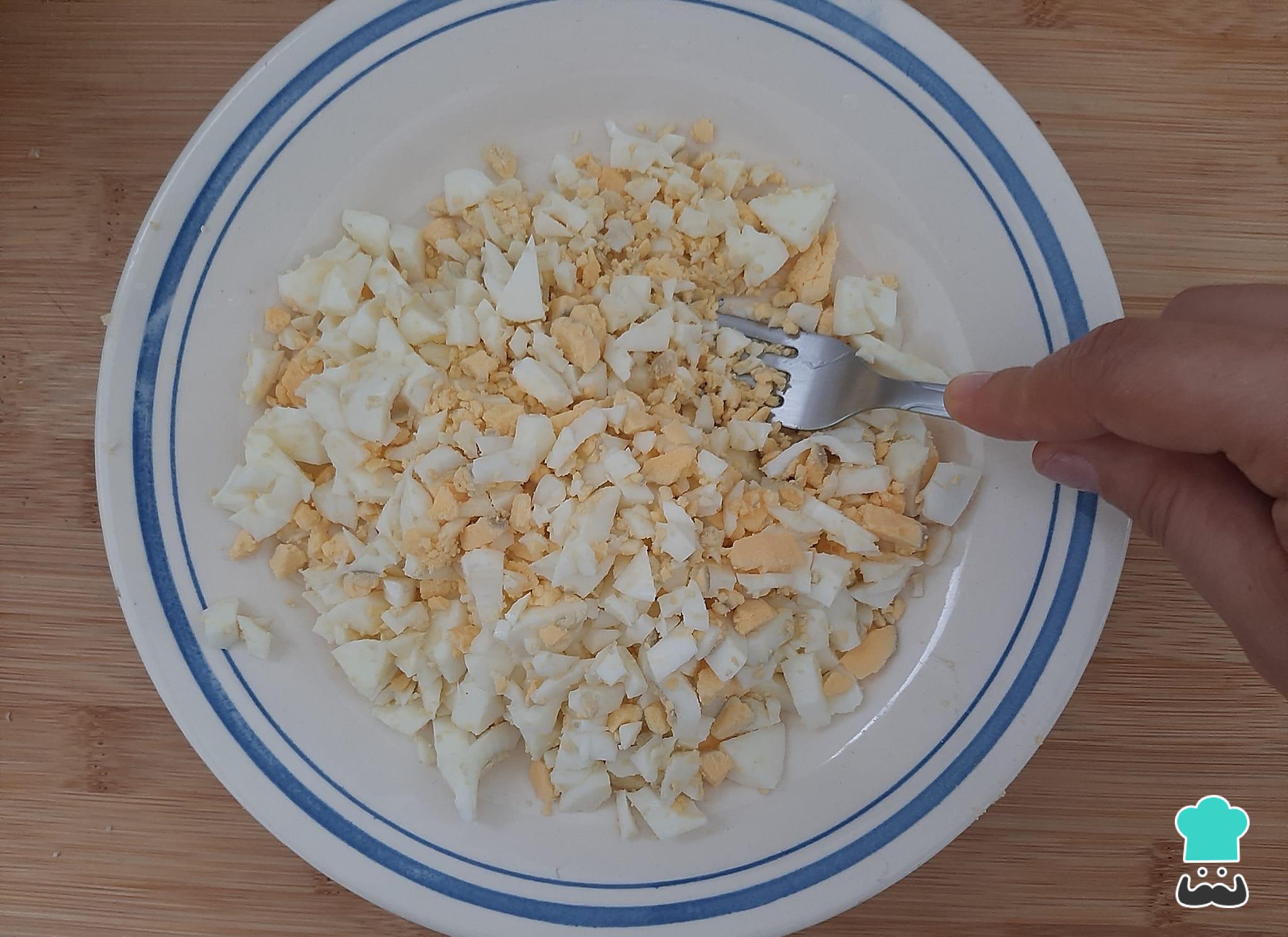 Com um garfo, amasse o ovo já cozido e picado. Reserve.
