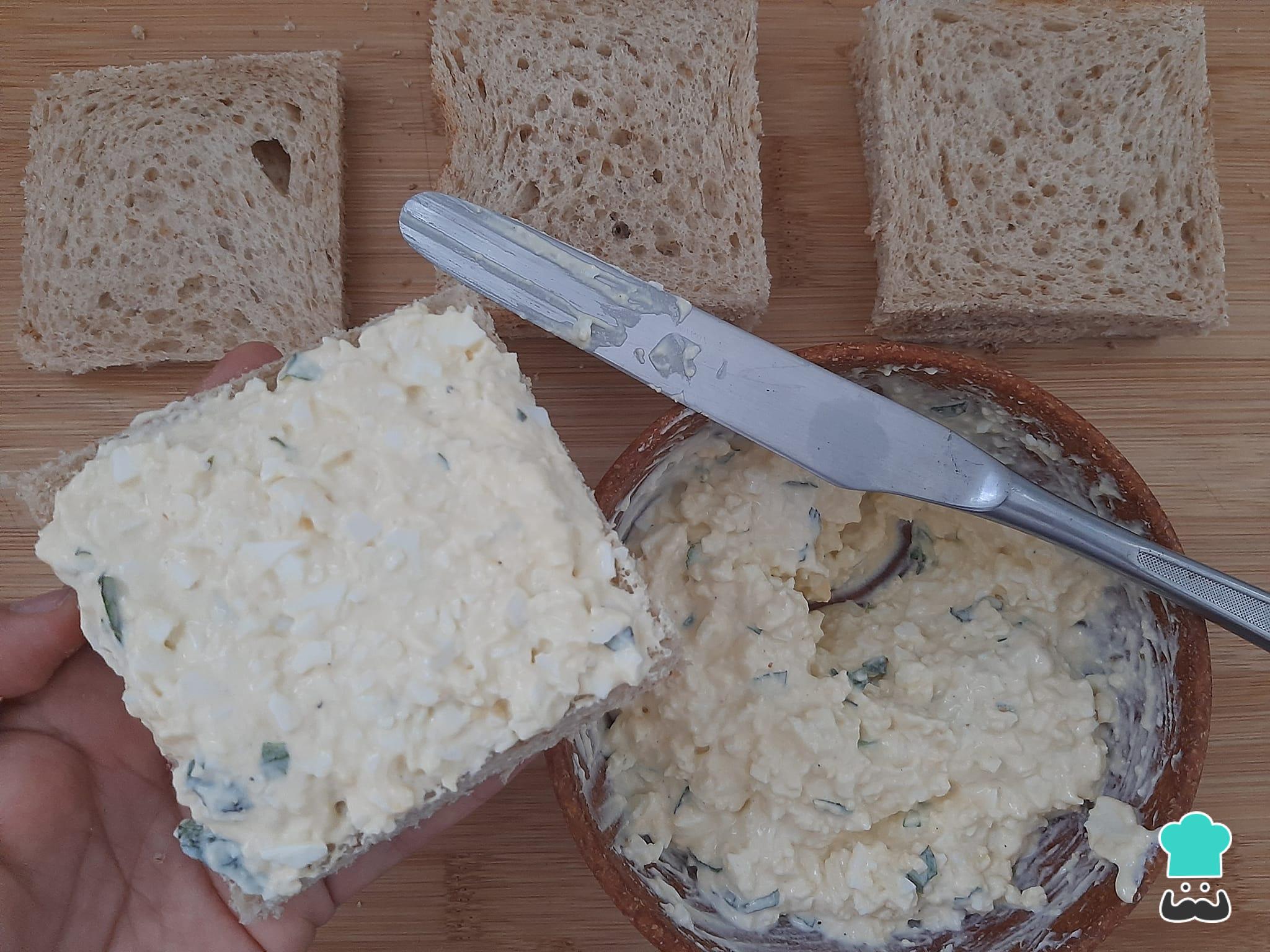 Passe a pastinha de ovo cozido nas fatias dos pães, formando sanduíches. Sirva-os a seguir!