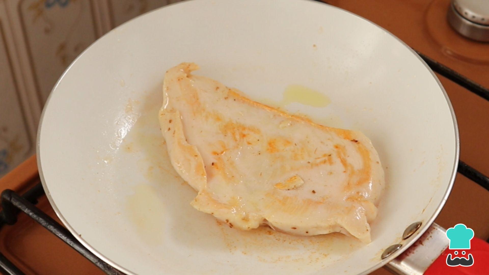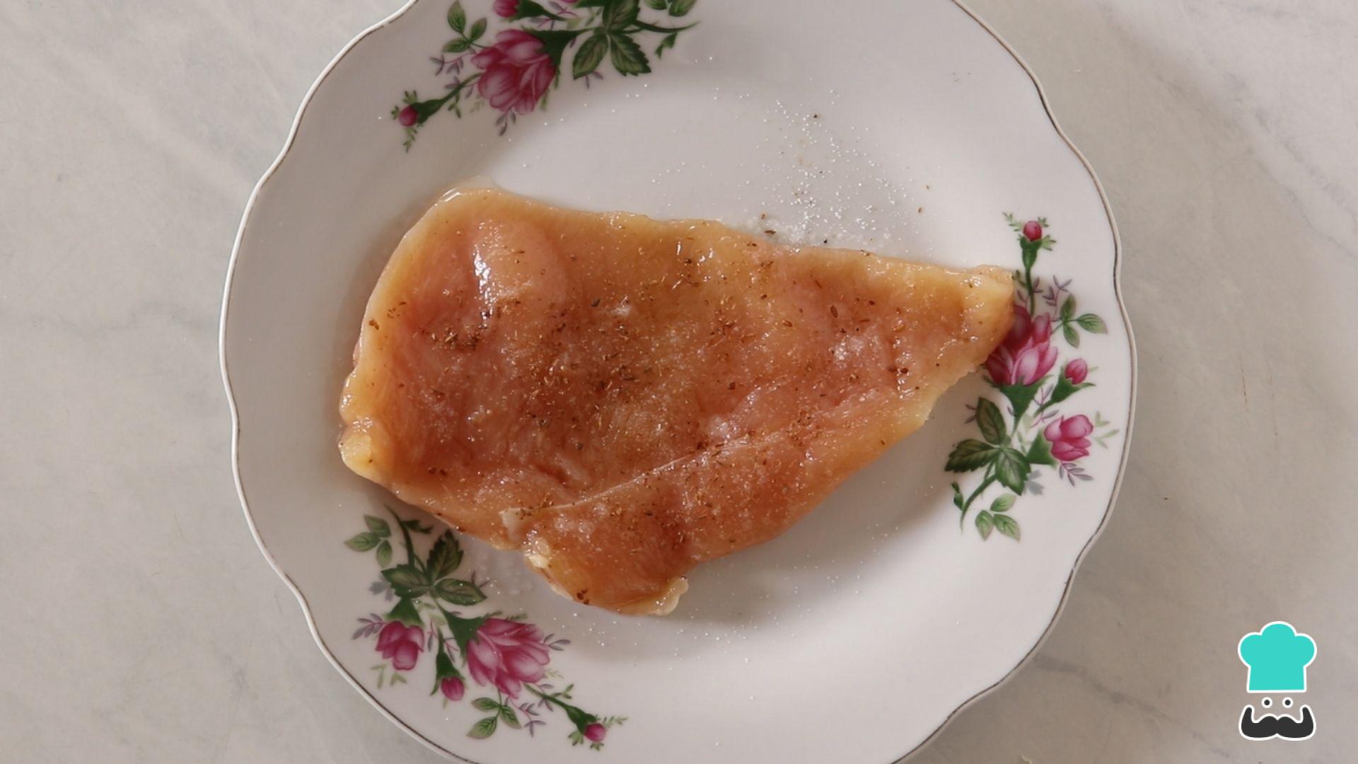 Para o recheio desse sanduíche, vamos temperar um filé de frango com sal, pimenta e cominho a gosto.