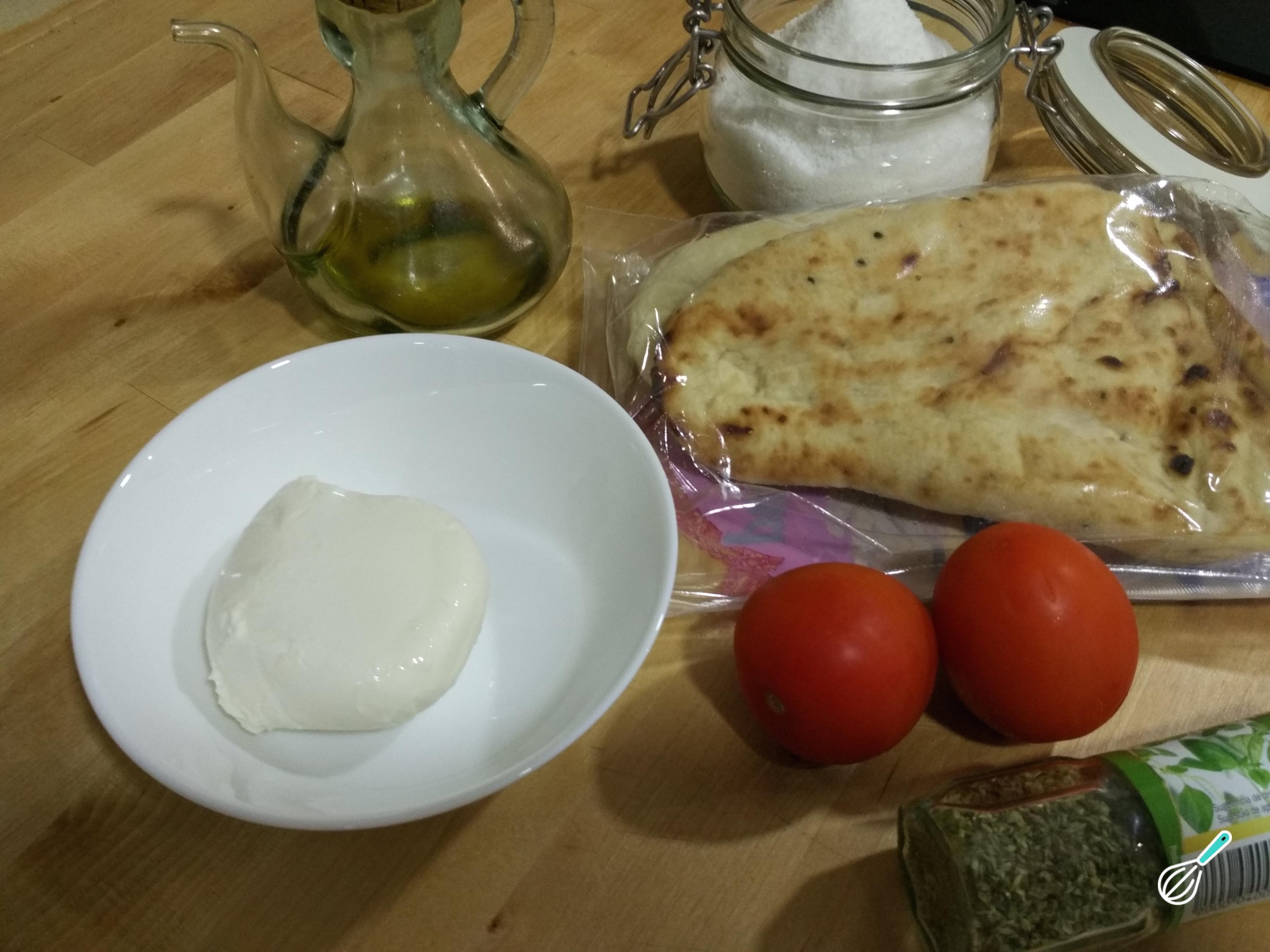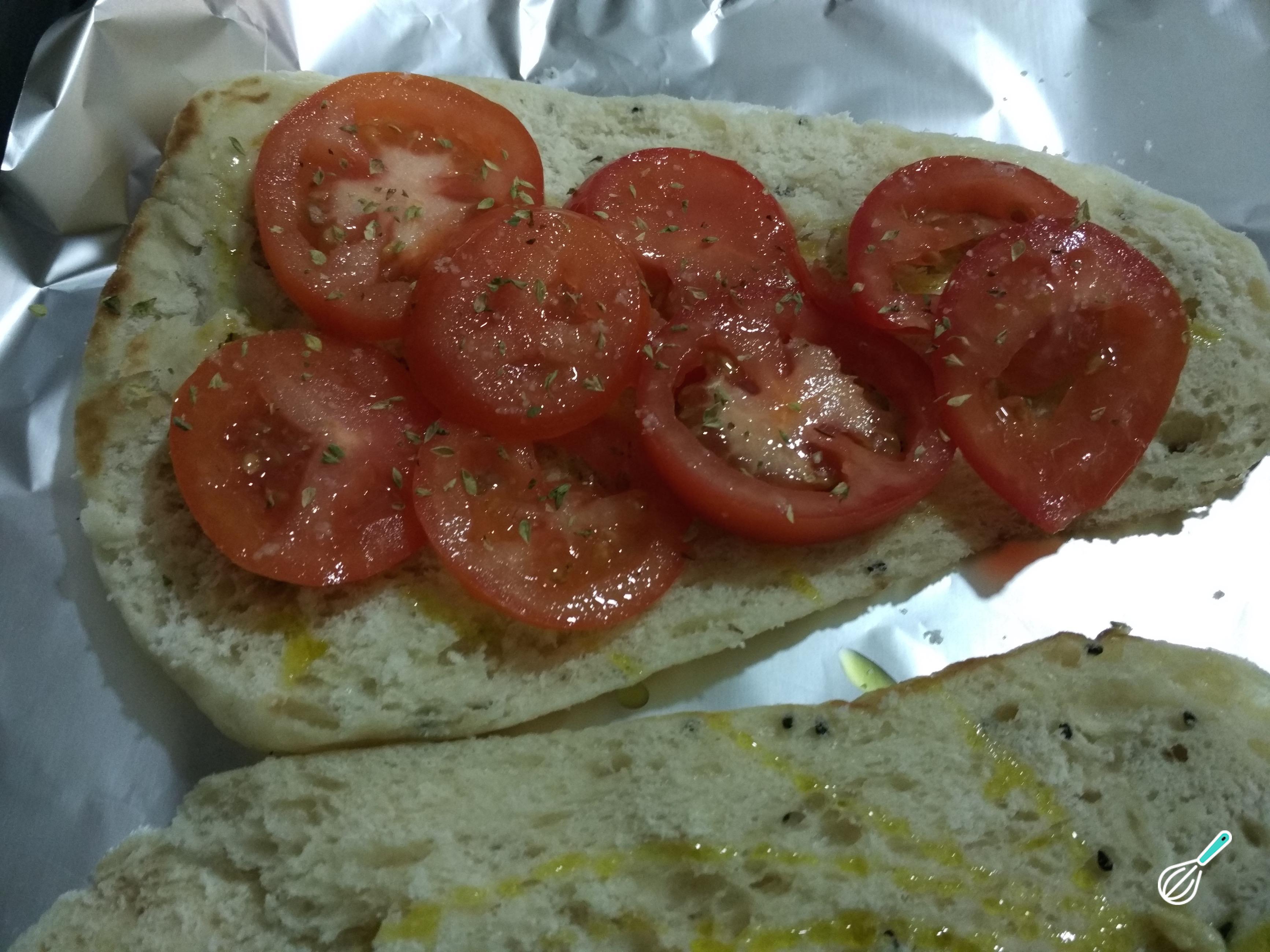 Abra o pão sírio ao meio e coloque-o em uma assadeira com papel manteiga ou alumínio. Regue o pão com pouco de azeite e acrescente as fatias de tomate, um pouco de sal e um pouco de oréganos.