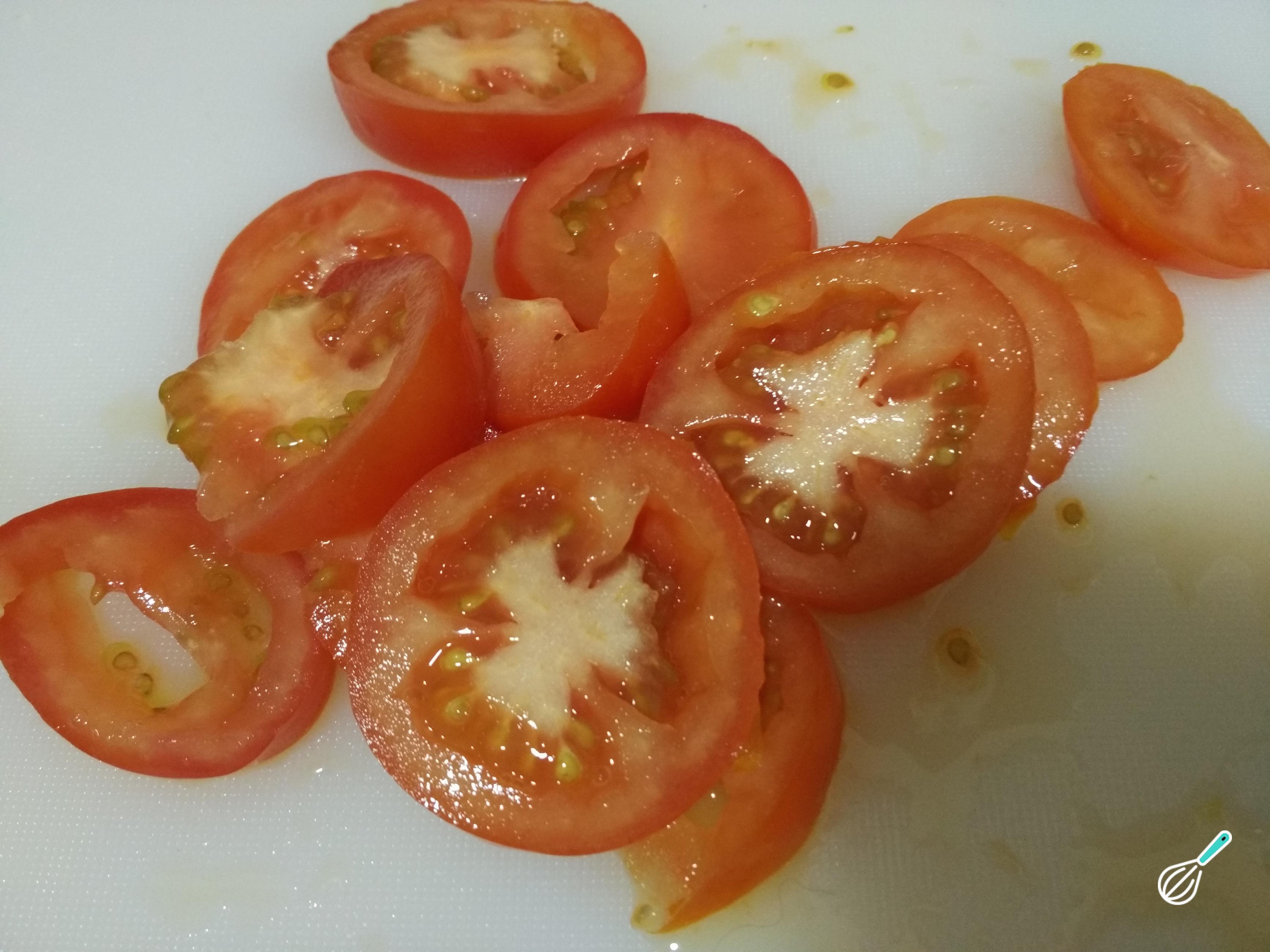 Em seguida lave os tomates e corte em fatias finas. Reserve.