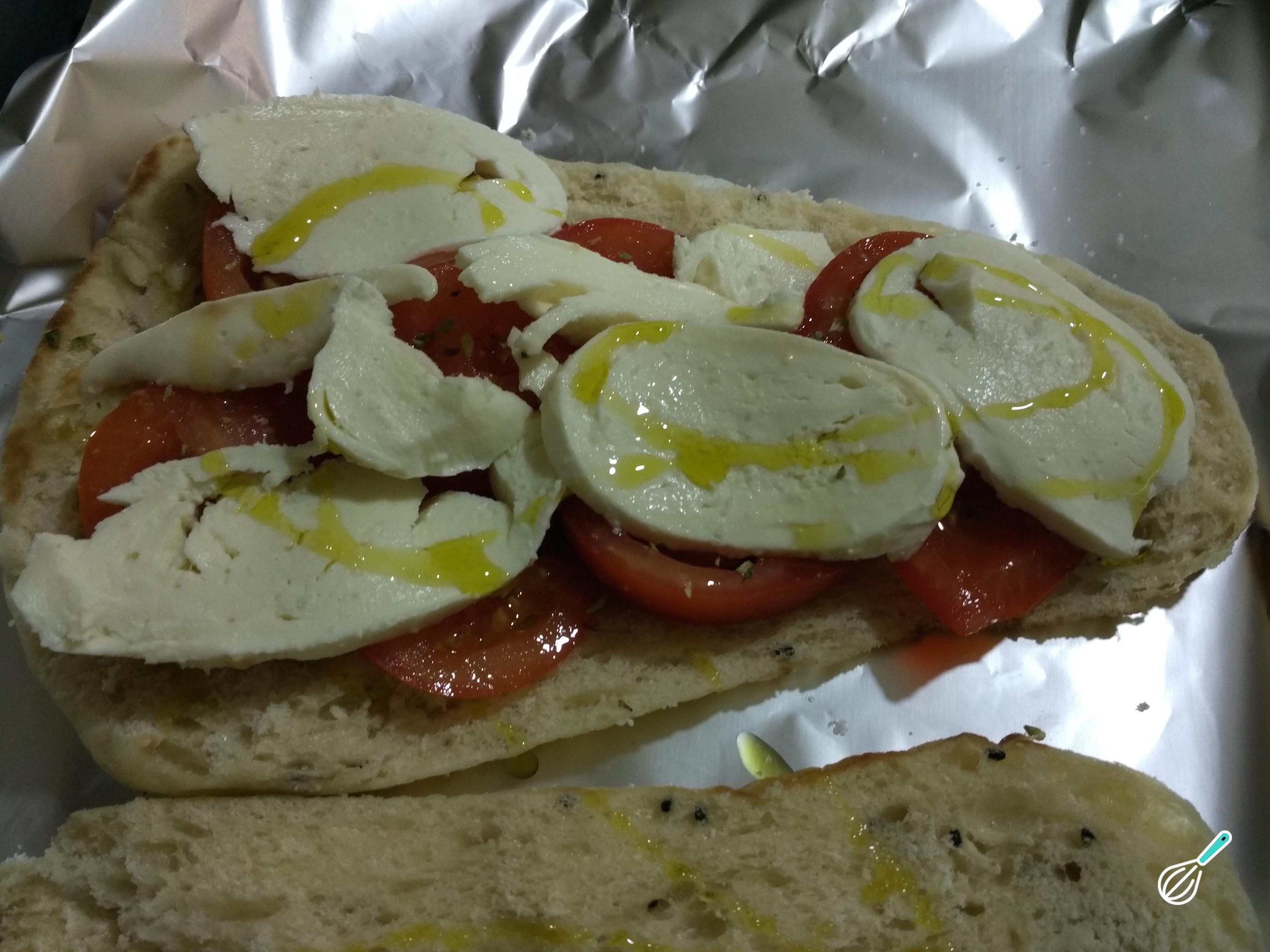 Então adicione o queijo mussarela, também cortado em fatias, regue com um fio de azeite e tempere com sal.
