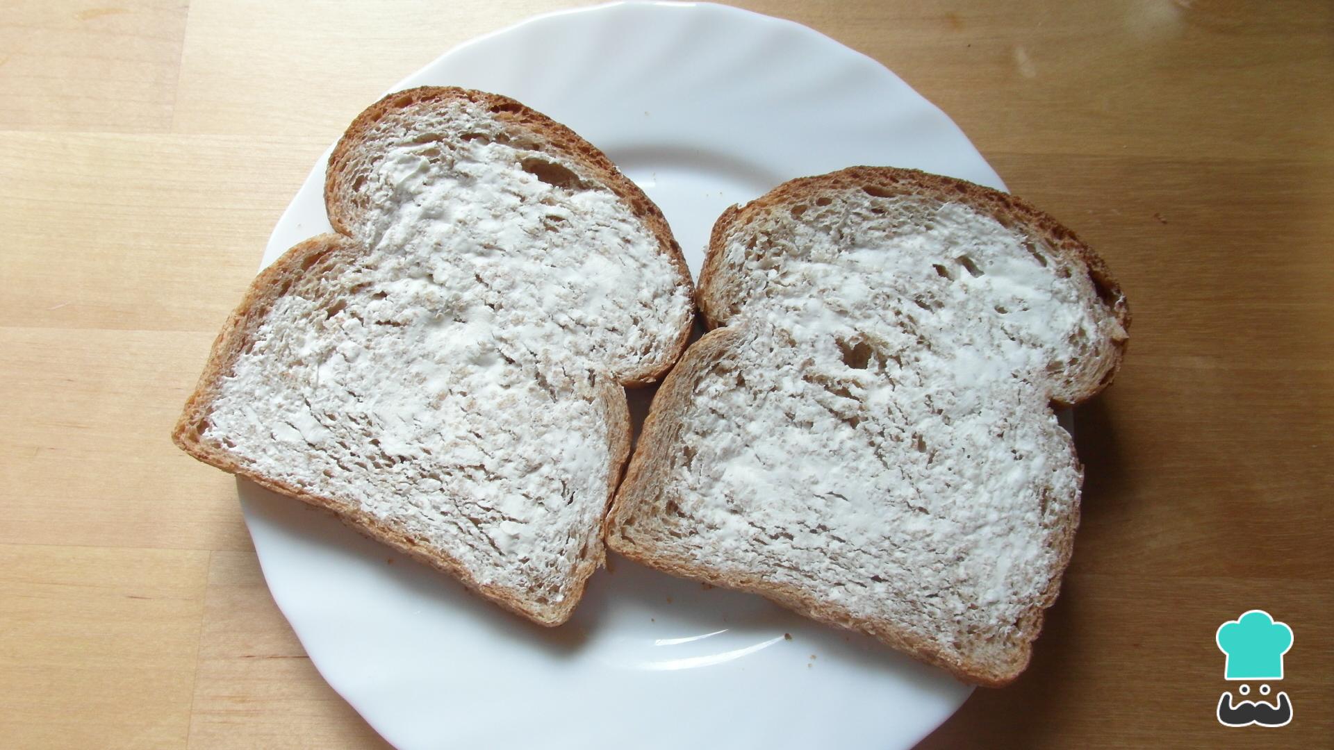 Espalhe um pouco de cream cheese em cada fatia de pão. Este ingrediente é um substituto mais saudável da maionese e confere mais sabor a este nosso sanduíche.