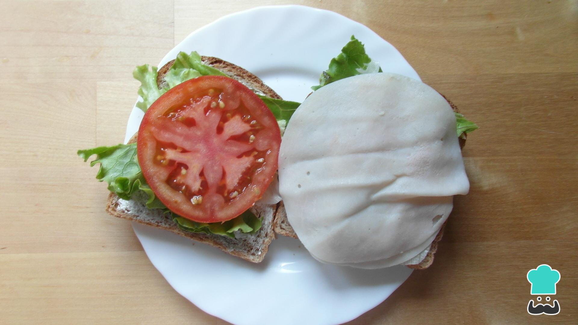 Coloque os pedaços de alface sobre as fatias de pão e acrescente o tomate e o presunto de frango.
