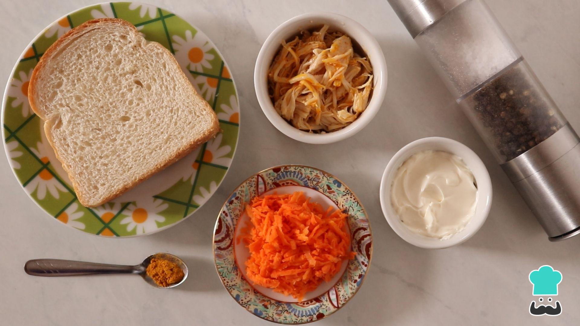 Separe os ingredientes. Aqui nós usamos pão de forma tradicional mas você pode optar por outro tipo de pão integral, com grãos e etc. O frango já deve estar temperado, cozido e desfiado e aqui você já pode caprichar no tempero! Nós indicamos azeite, alho, cebola, colorau, sal e pimenta para deixá-lo bem saboroso!