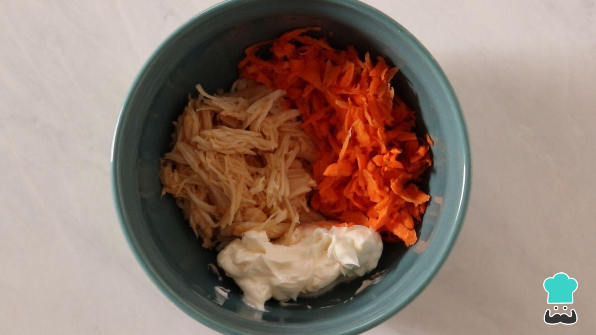 Agora é só misturar os ingredientes do recheio: o frango cozido e desfiado, a cenoura (que deve estar ralada) e o requeijão. Tempere com sal e pimenta. Para dar um sabor a mais, coloquei uma pitada de curry em pó.