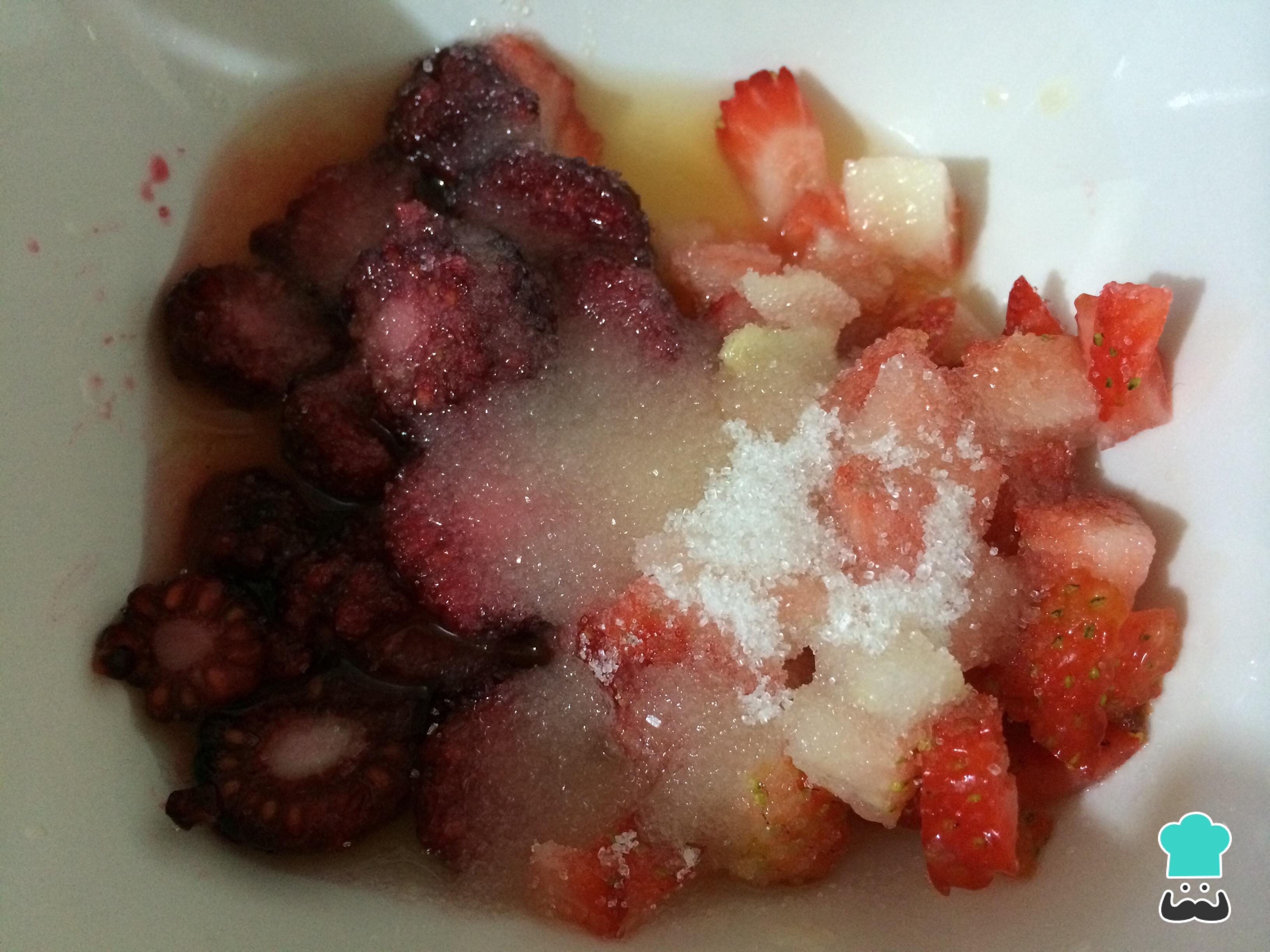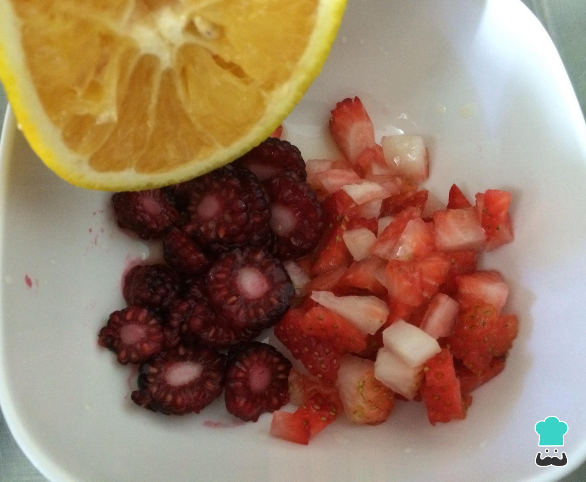 Em uma tigela, adicione os morangos e as amoras cortadas em pequenas porções, adicione o suco de meia laranja e misture muito bem.