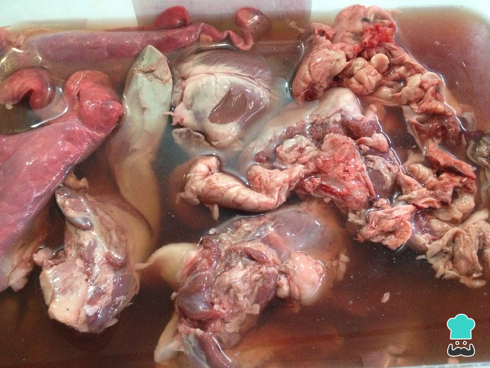 Para esta receita de sarapatel de porco, comece por cozer os miúdos do porco em água e suco de limão. Para dar mais gosto, pode colocar o restante de limão a cozer com os miúdos do porco.