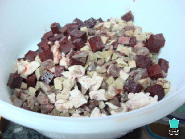 Corte o sangue em pedaços pequenos, bem como os miúdos de porco cozidos.