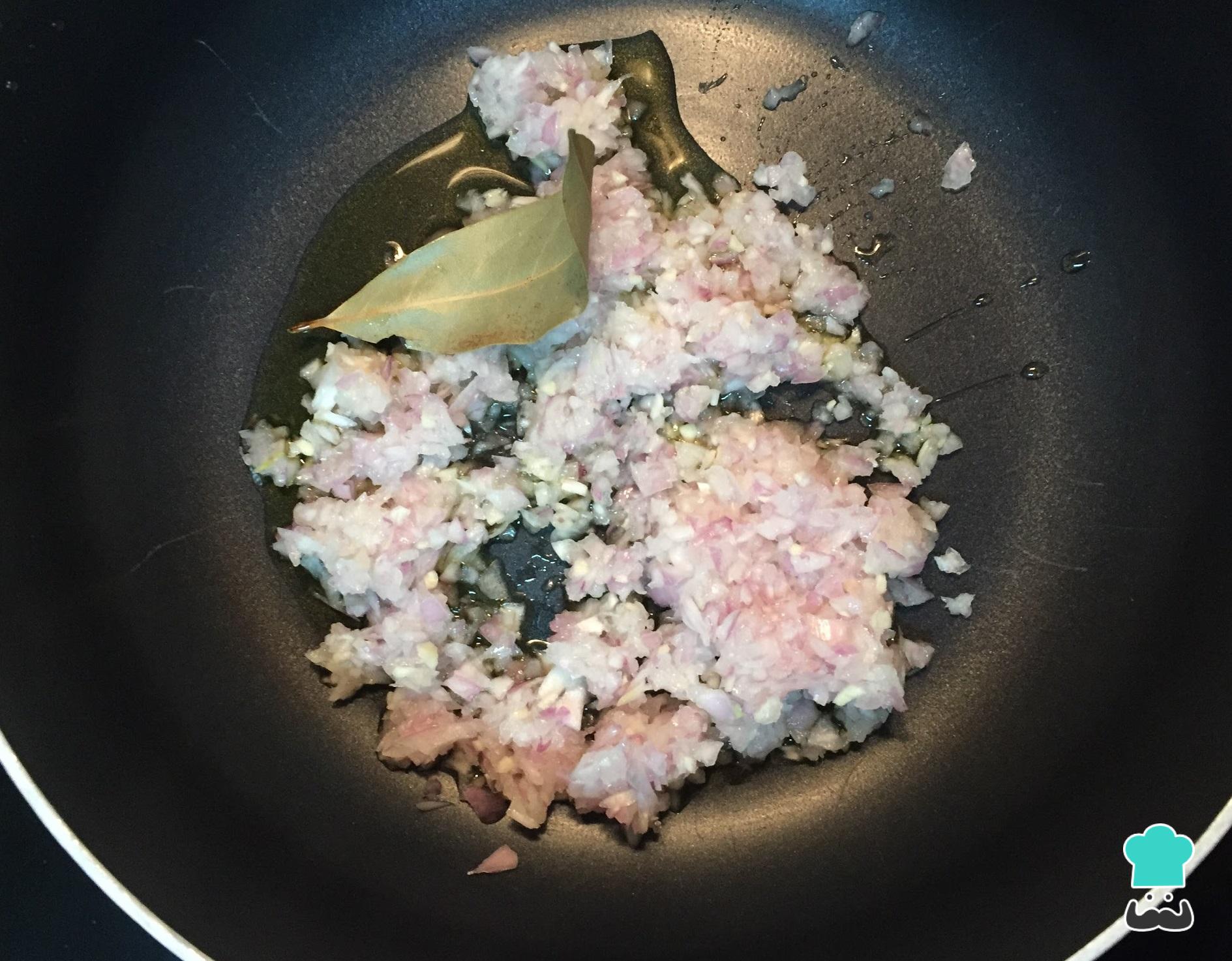 Em uma panela, coloque o azeite, a banha de porco e refogue um pouco a cebola os alhos com a folha de louro.