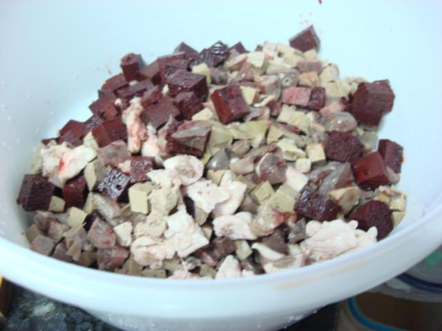 Comece por higienizar os miúdos: enxague rapidamente os miúdos e o sangue sob água corrente. Depois coloque-os numa vasilha grande, esprema o suco de 4 limões diretamente sobre os miúdos e cubra com água. Lave nessa água com suco de limão até os miúdos ficarem limpos e sem cheiro forte.
