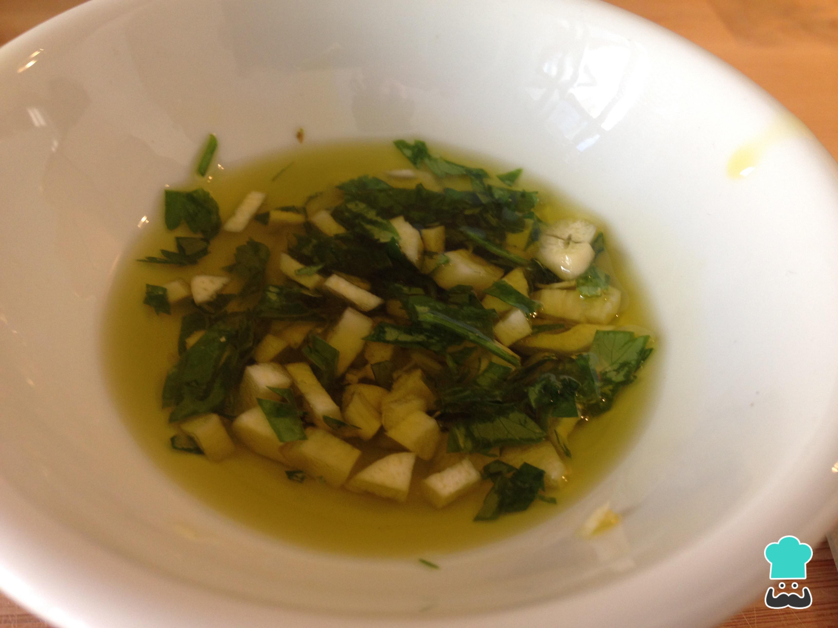 Para temperar a sardinha pique finamente a salsinha e os alhos e misture com o azeite de oliva.