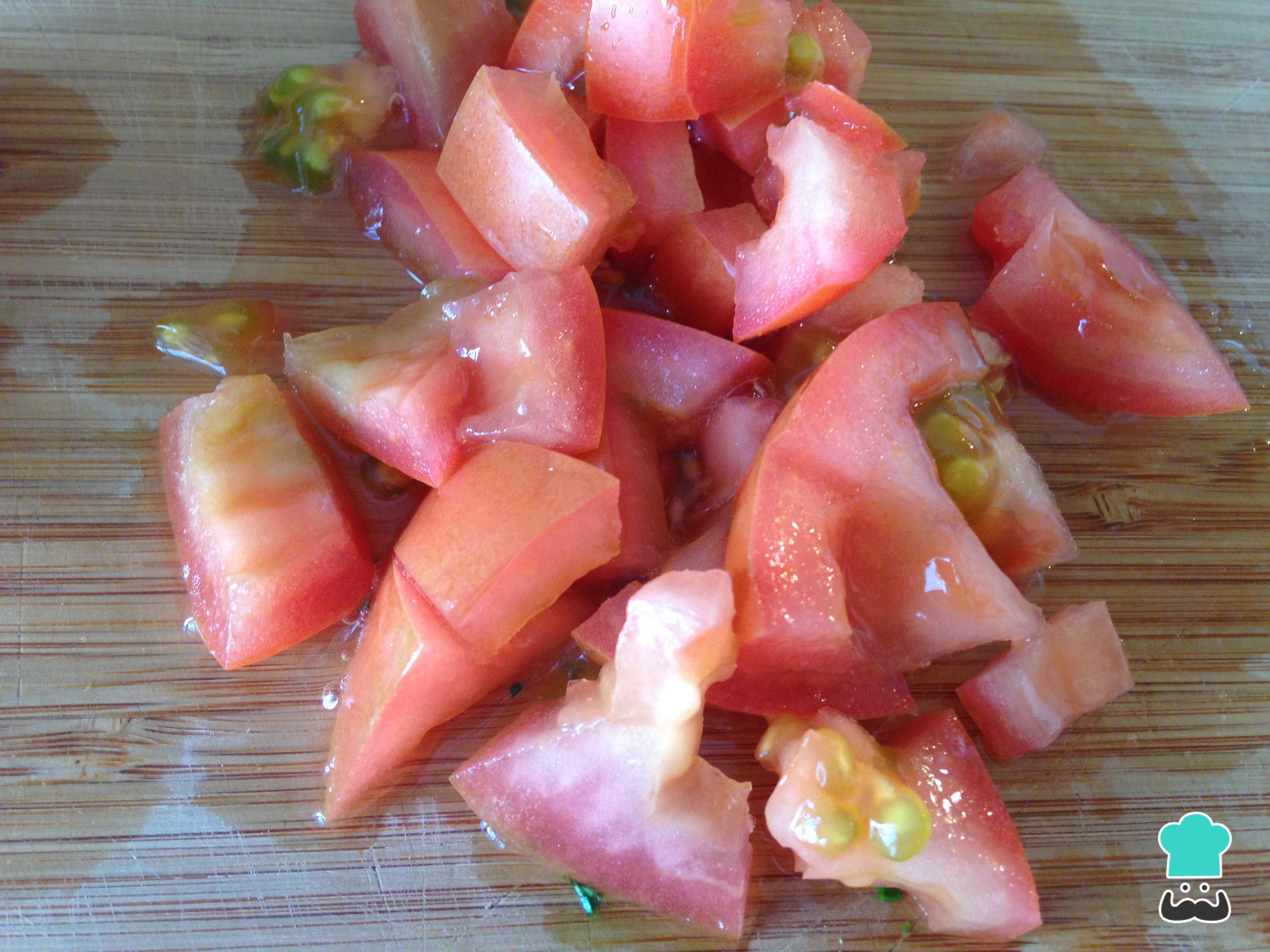 Enquanto isso, corte os tomates em cubos e tempere com sal, pimenta e azeite.
