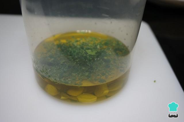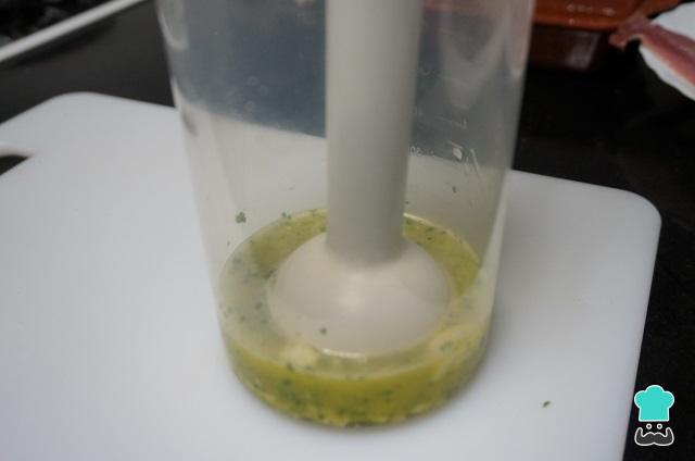 Prepare o tempero colocando no liquidificador ou em um copo de mixer o azeite de oliva, os alhos, a salsinha e sal a gosto.