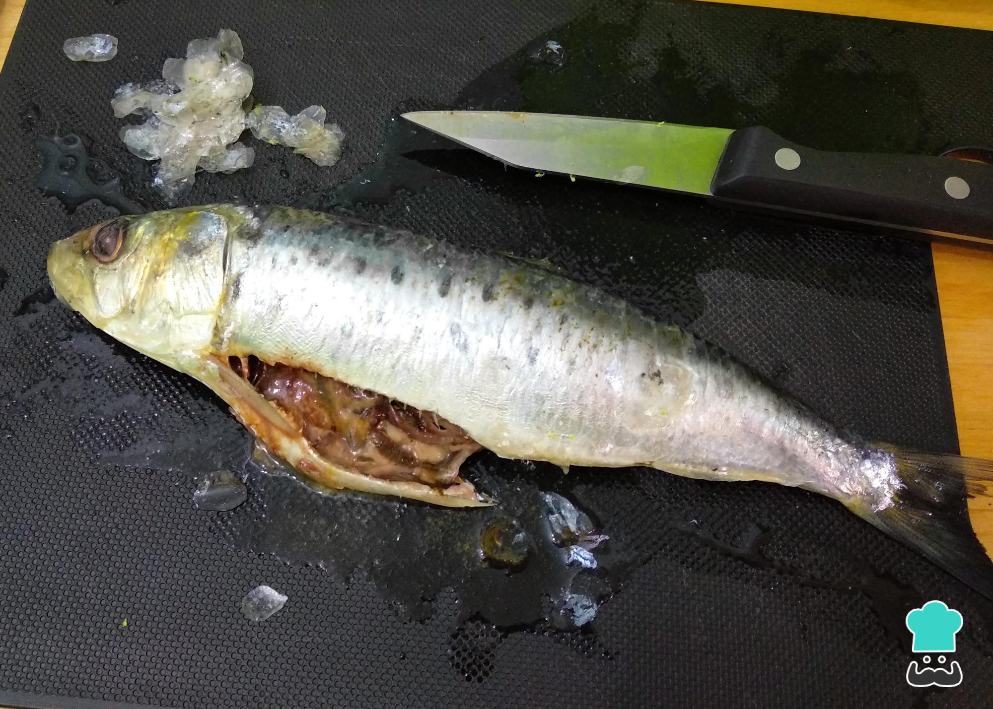 Limpe bem as sardinhas retirando-lhe a cabeça, as escamas, as vísceras e as espinhas. Passe as sardinhas por água corrente para lavar os vestígios de escamas e vísceras. Tempere as sardinhas com sal por dentro e por fora.