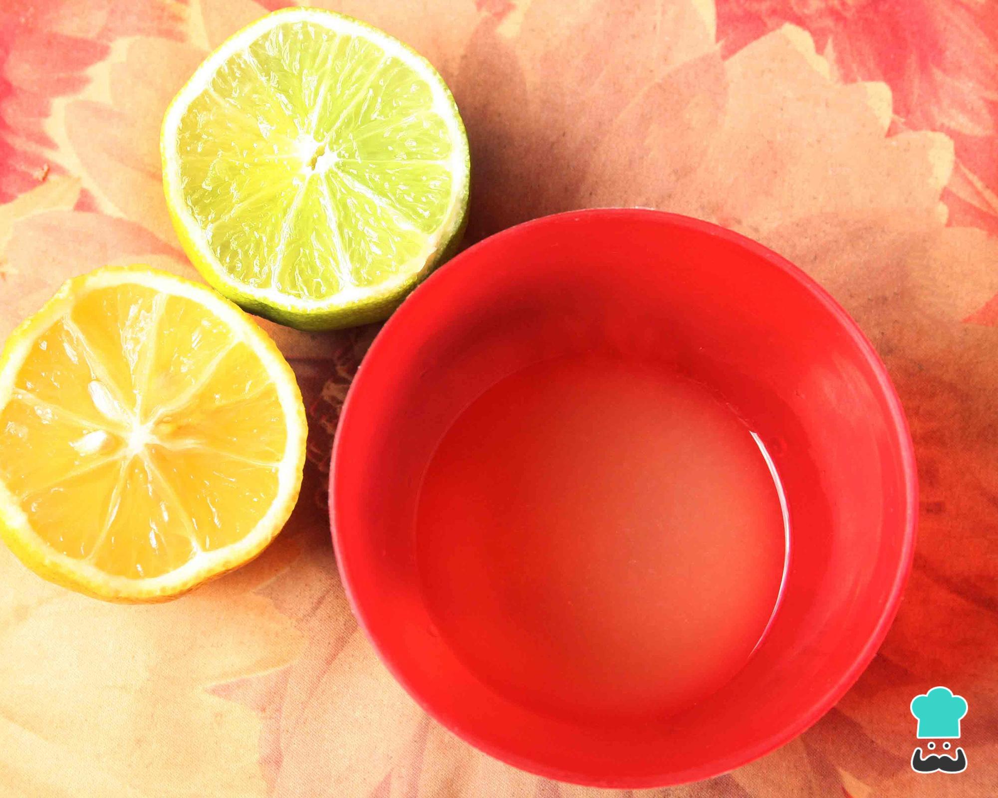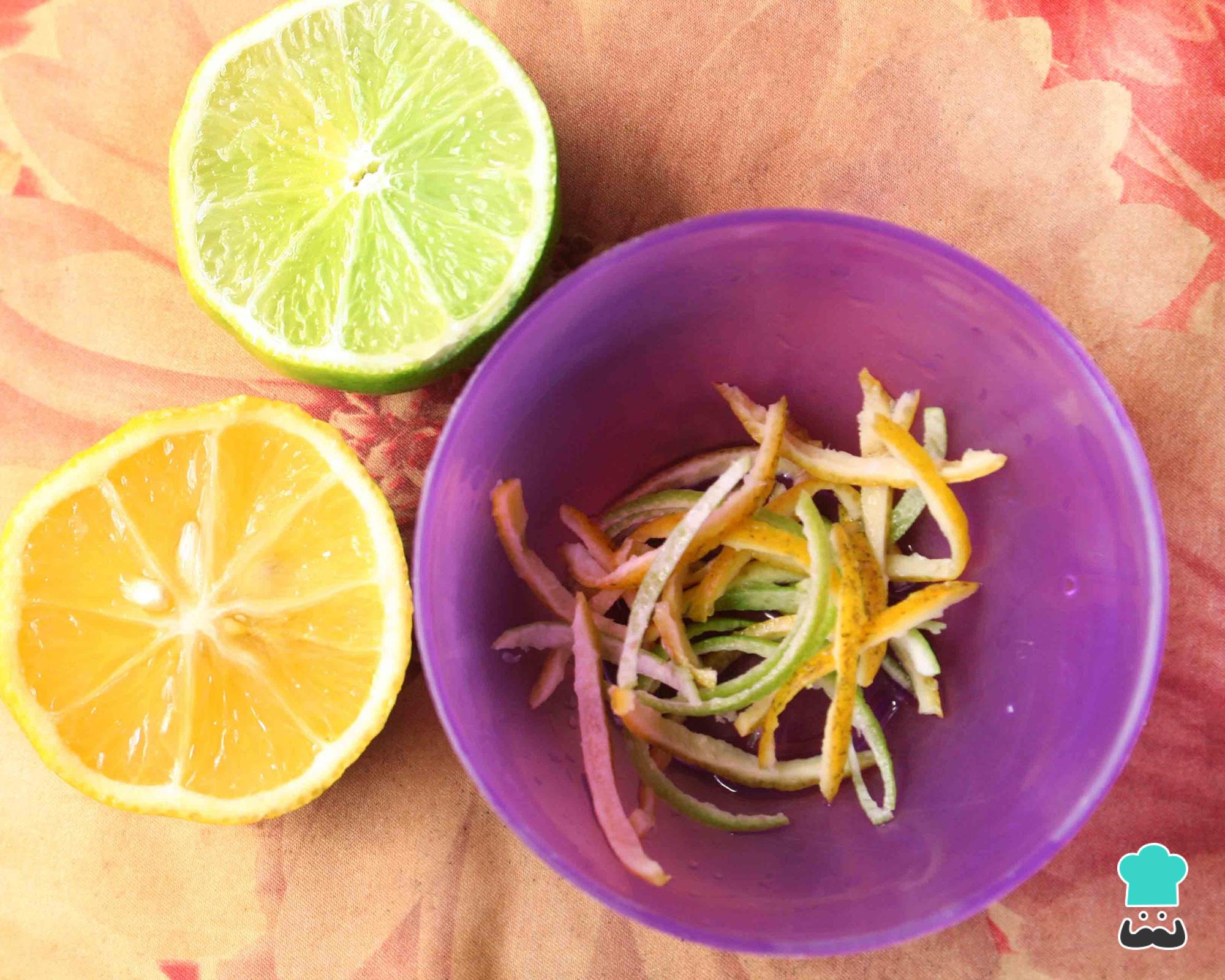 Descasque meio limão e meia laranja, evitando a parte branca. Corte as cascas em juliana, como na fotografia, e reserve.