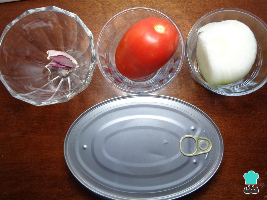 O primeiro passo para preparar as sardinhas enlatadas com molho de tomate, é juntar todos os ingredientes necessários.
