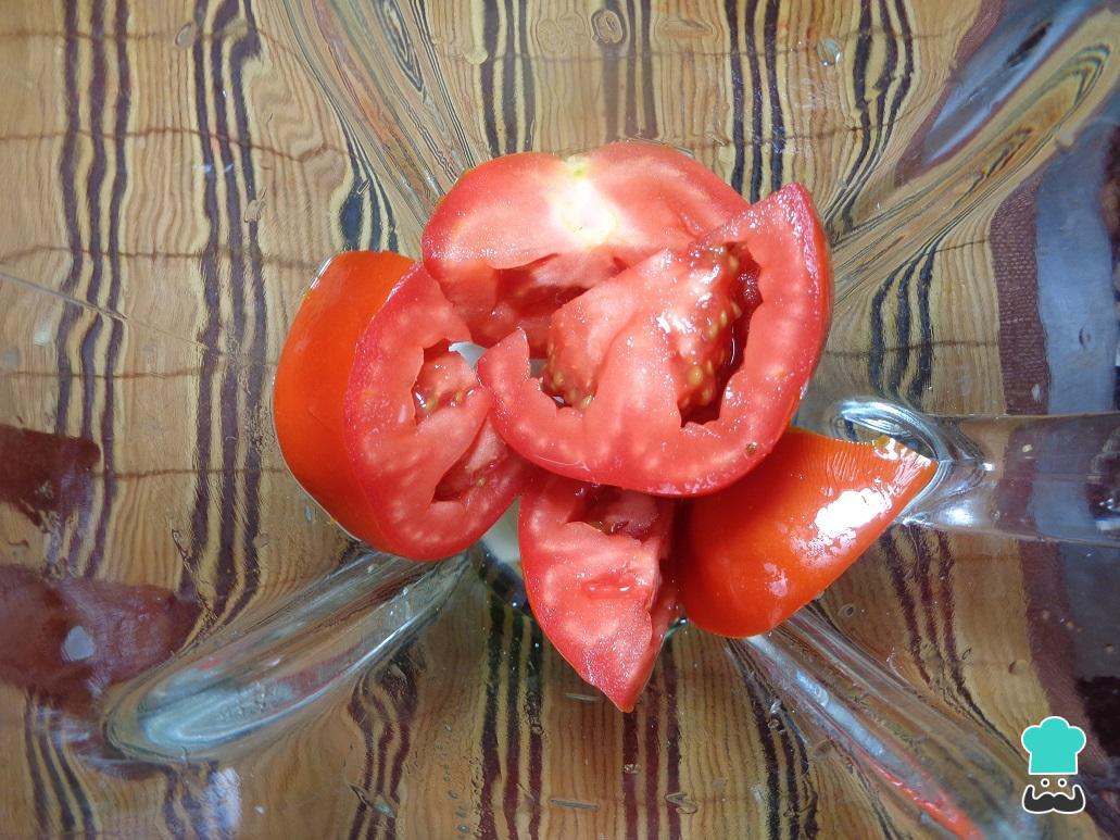 De seguida corte o tomate e a cebola em pedaços grandes. Coloque-os em liquidificador, juntamente com o alho, com as pimentas e deixe bater até obter um molho homogêneo.