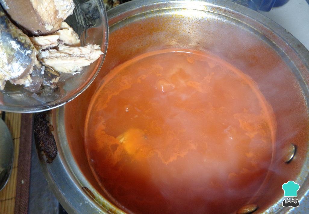 Adicione as sardinhas ao molho de tomate e deixe cozer por cinco minutos, para as sardinhas ganharem o gosto do tomate.