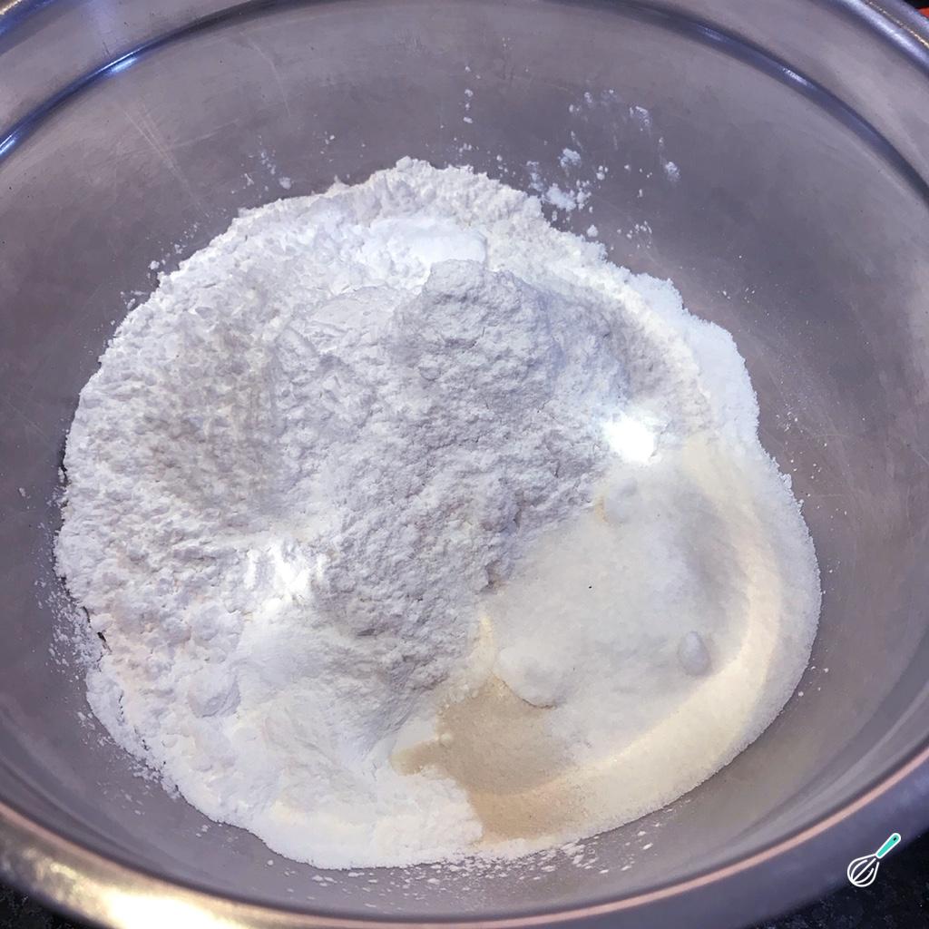 Numa tigela à parte misture os ingredientes secos desta receita de scone inglês com farinha de arroz: a farinha de arroz com o polvilho, o fermento, a goma xantana, o açúcar e o sal.