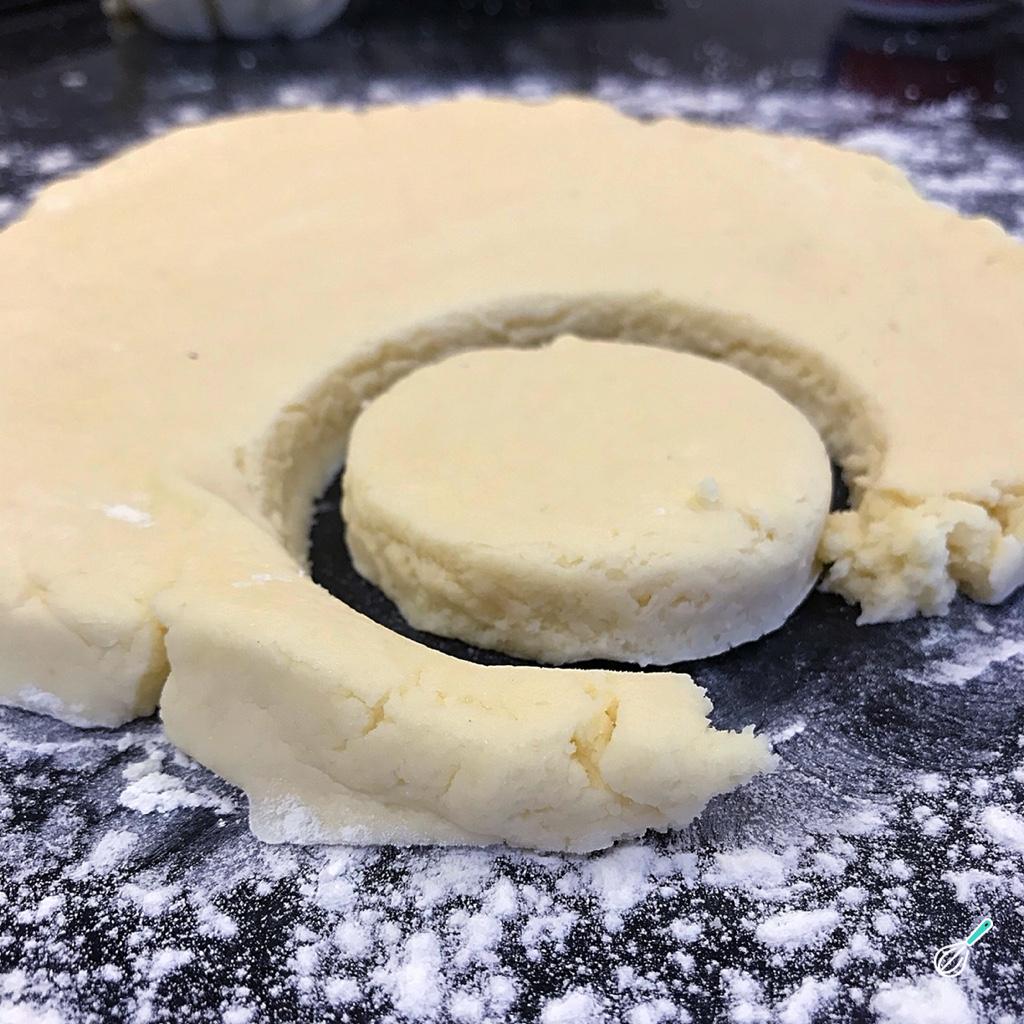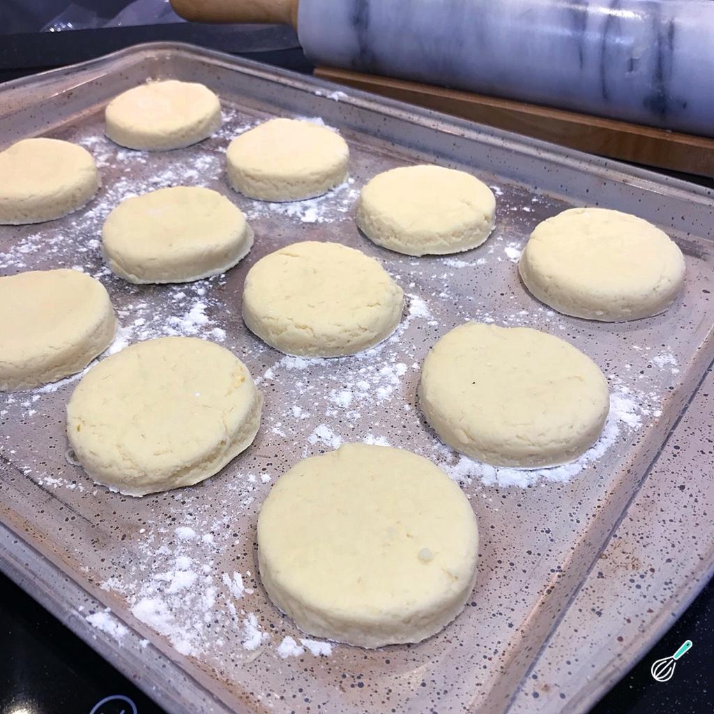 Abra a massa dos scones ingleses com mais ou menos 2,5 cm de espessura e corte em formato redondo.